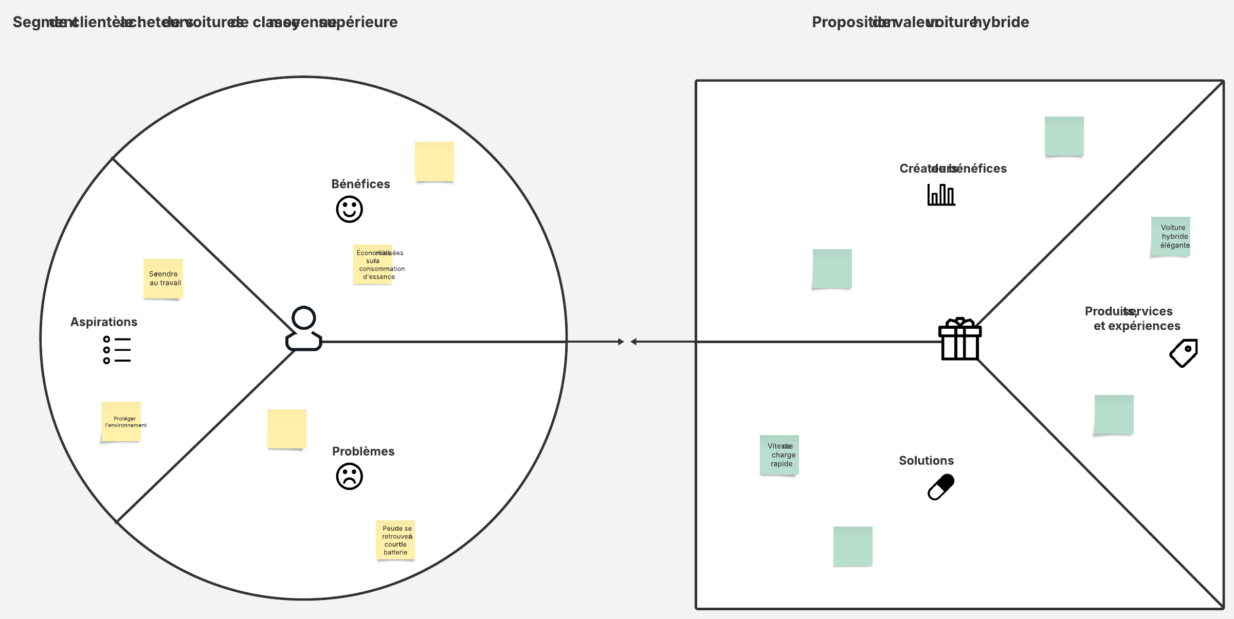 Visualisez la valeur que vous pouvez apporter à vos clients en remplissant ce canevas de proposition de valeur. Mettez en parallèle les attentes des clients, leurs problèmes potentiels et les bénéfices escomptés avec ce que votre produit ou service apporte, afin de garantir une bonne adéquation produit-marché.