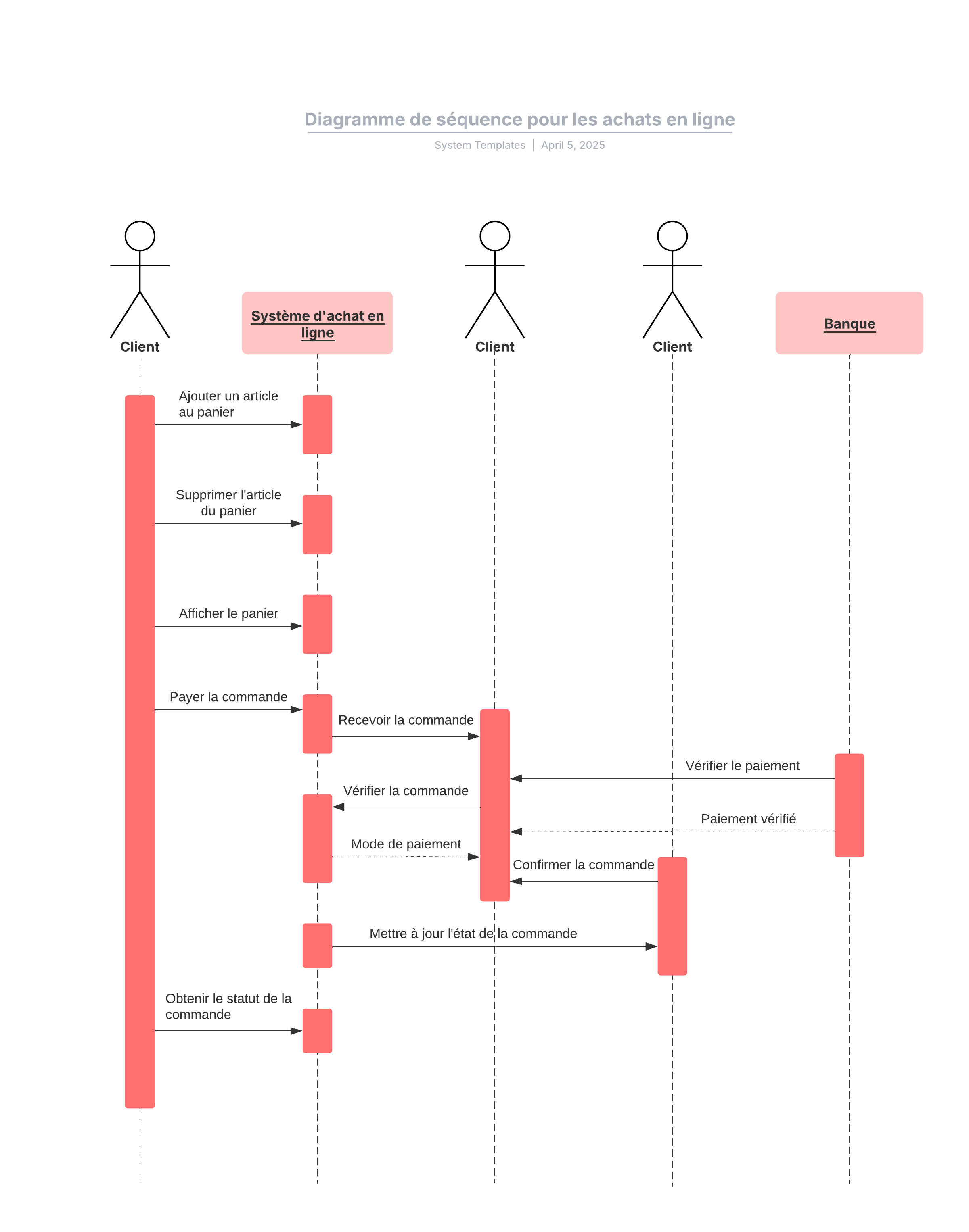 Ouvrez ce modèle pour afficher un exemple détaillé de diagramme de séquence pour les achats en ligne que vous pouvez personnaliser selon votre cas d'utilisation.