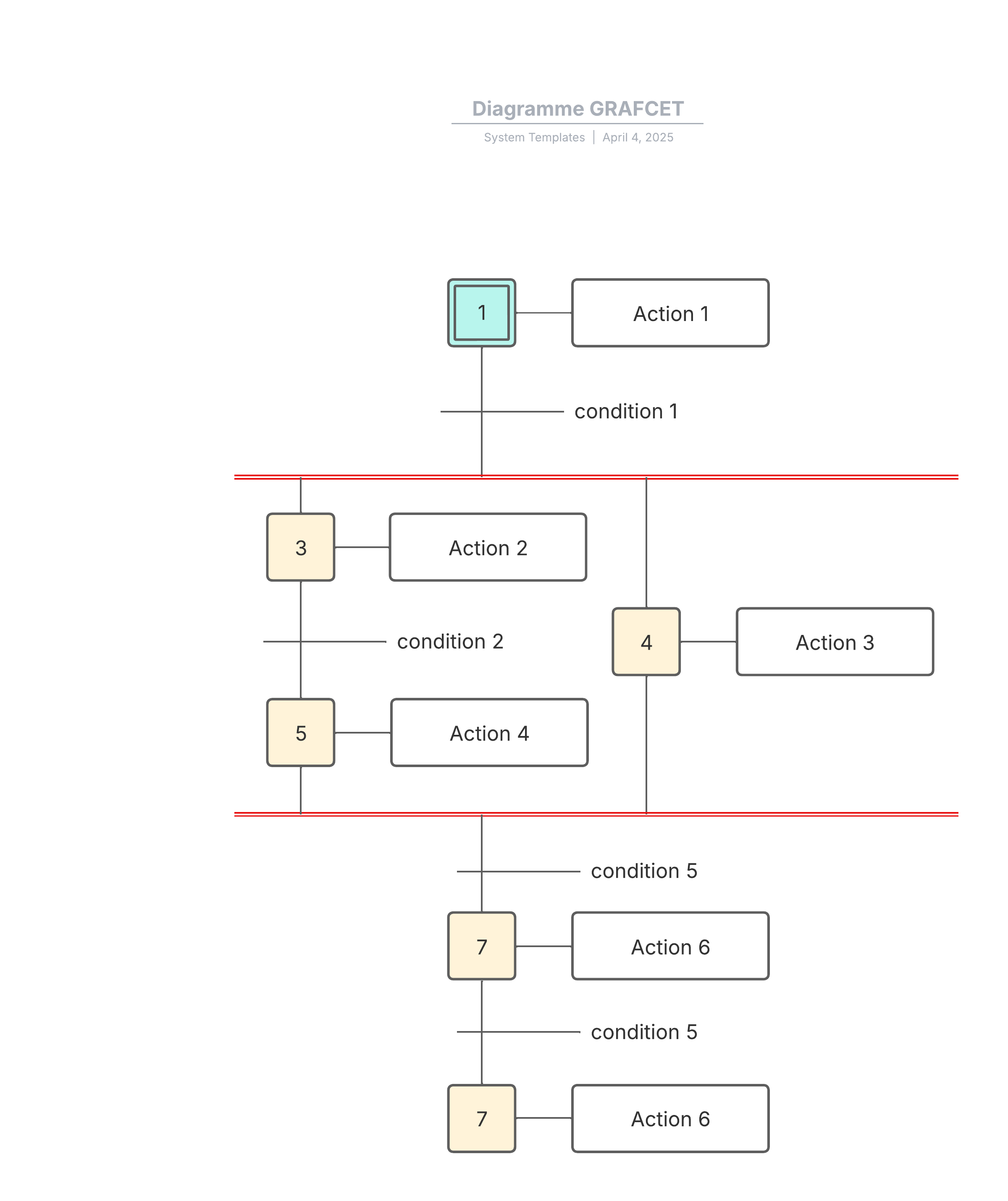 Ouvrez ce modèle pour visualiser un exemple détaillé de diagramme GRAFCET que vous pouvez personnaliser selon votre cas d’utilisation.