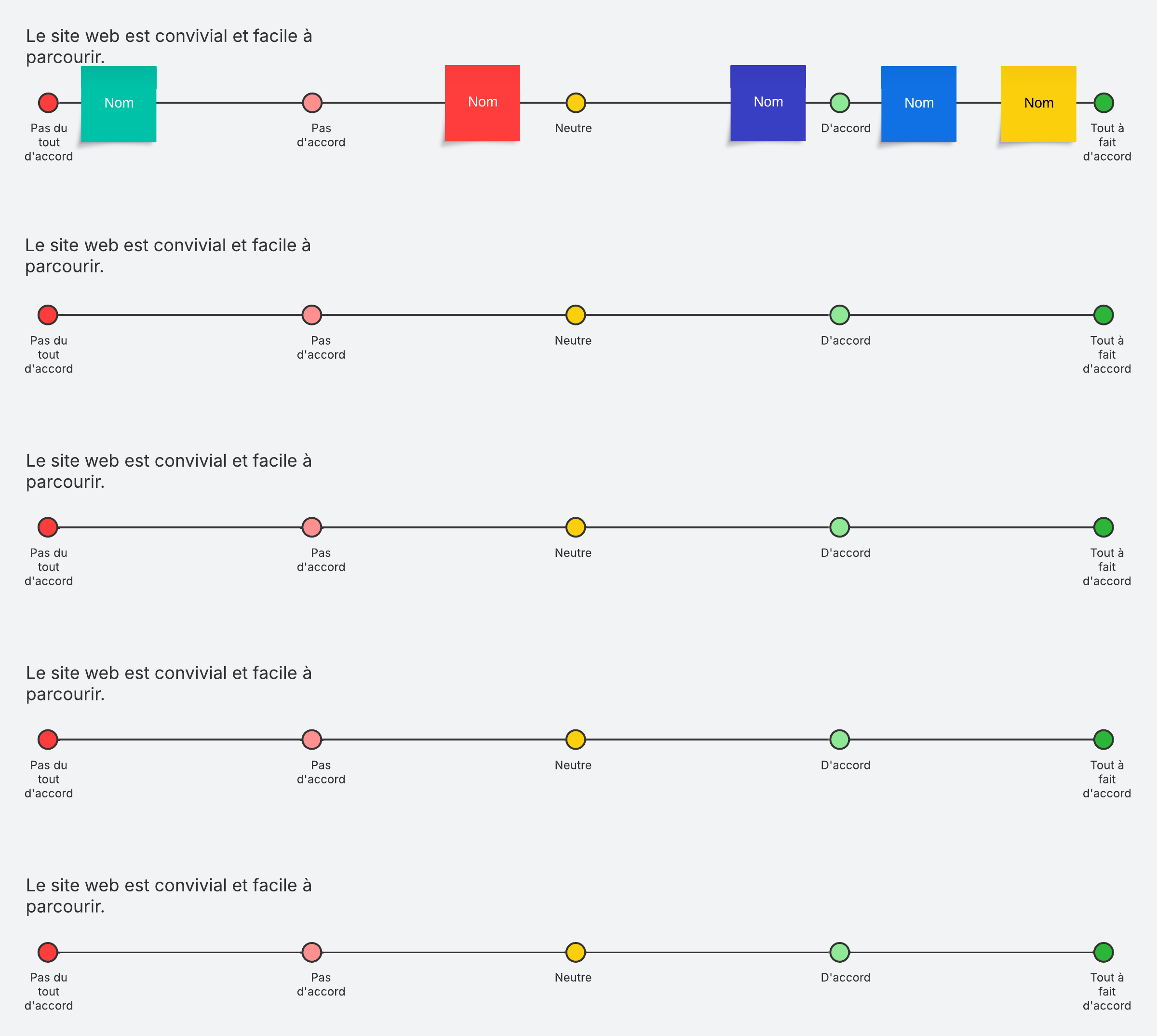 Une échelle de Likert est un outil d'évaluation qui peut être utilisé à des fins de recherche. Placez des post-its sur l'échelle pour mesurer l’attitude des utilisateurs vis-à-vis de vos affirmations.