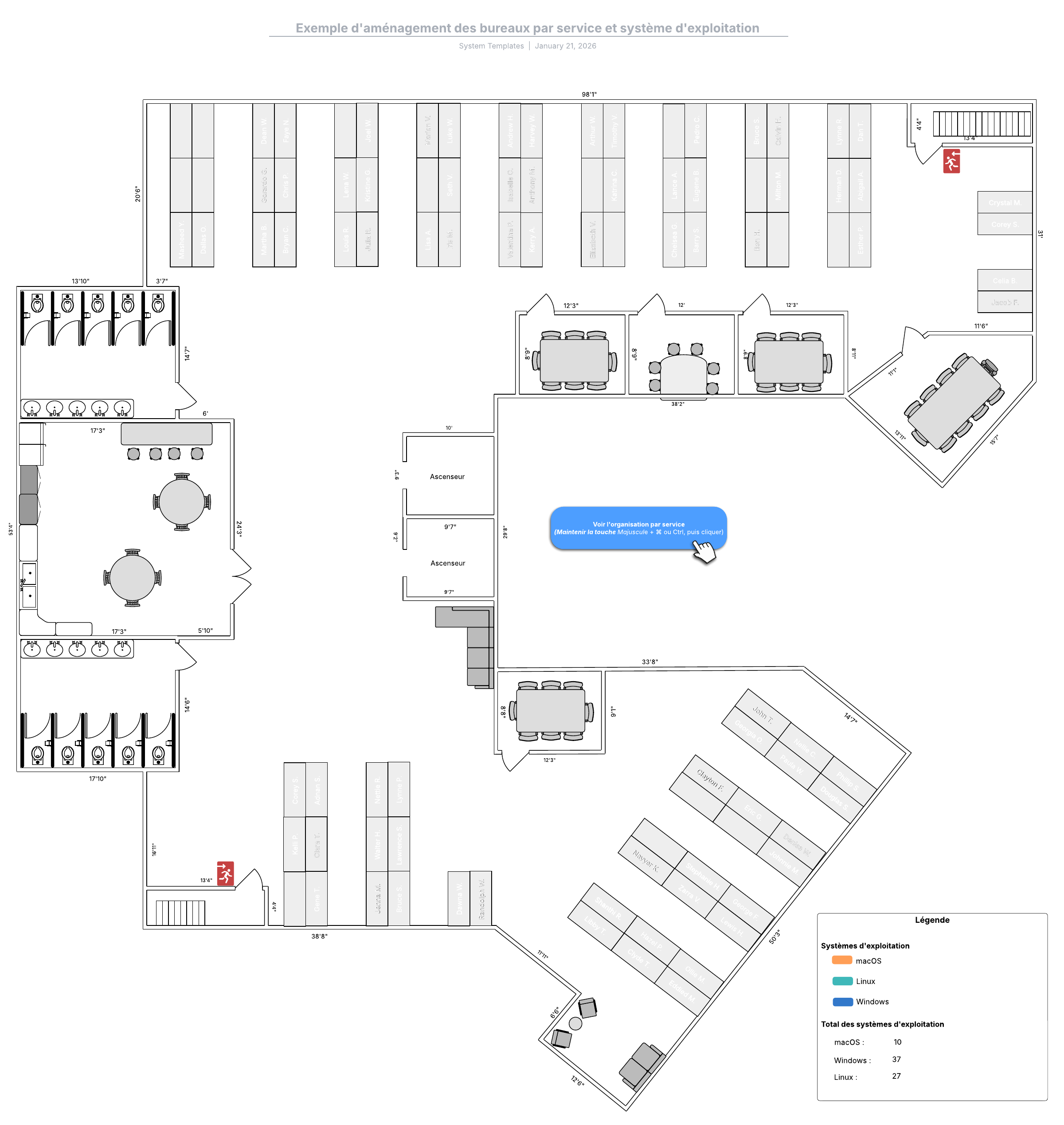Ouvrez ce modèle pour visualiser un exemple détaillé de plan de bureau, à personnaliser selon votre cas d'utilisation.