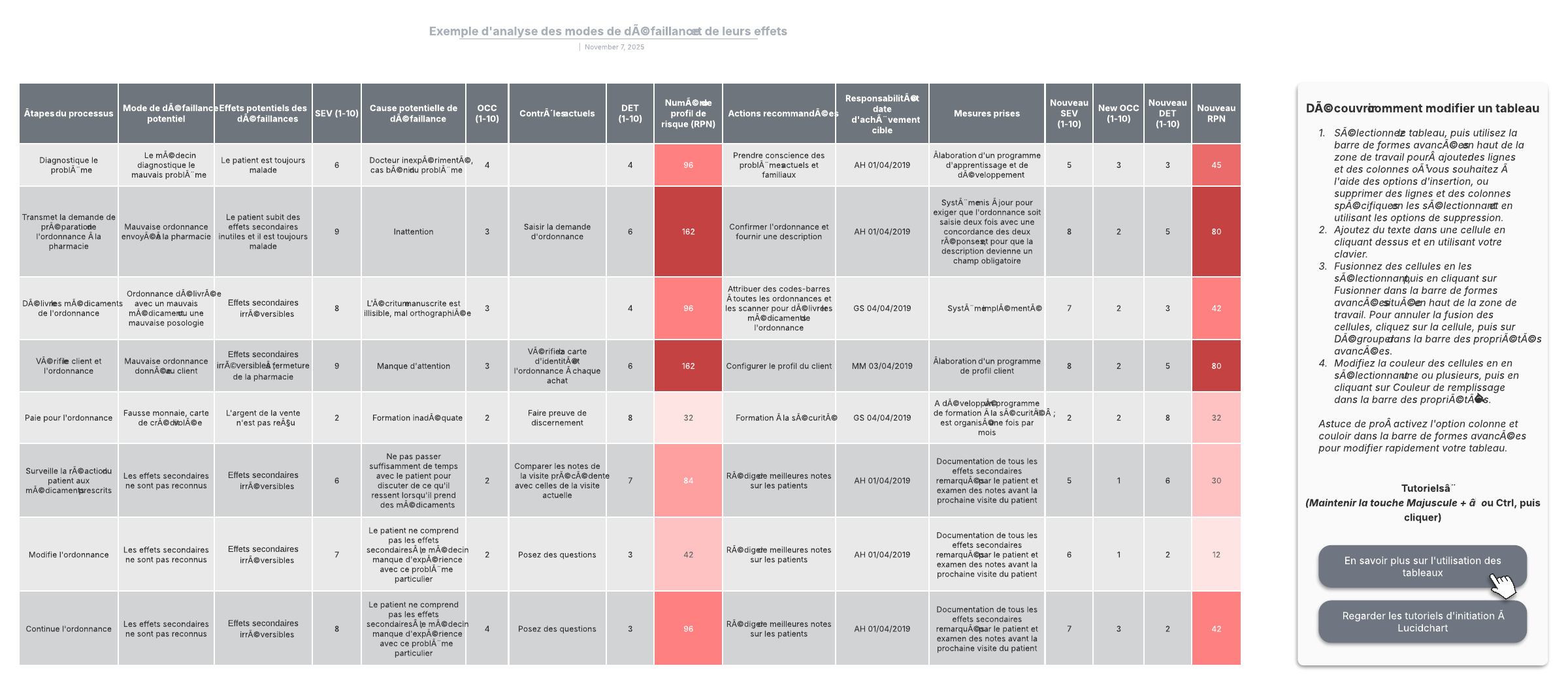 Ouvrez ce modèle pour visualiser un exemple détaillé d'une analyse des modes de défaillance et de leurs effets que vous pouvez personnaliser selon votre cas d'utilisation.