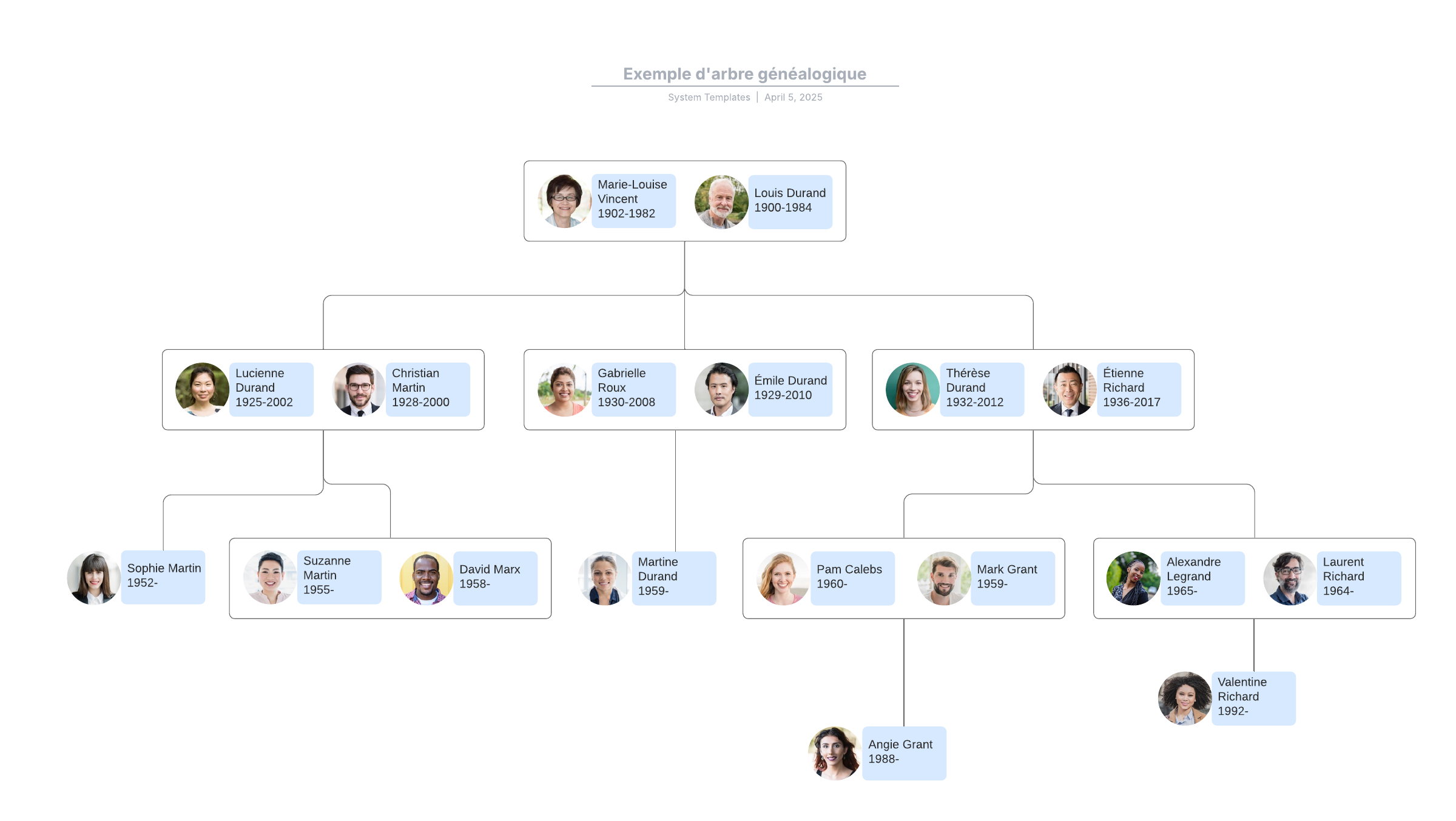 Ouvrez ce modèle pour afficher un exemple détaillé d'arbre généalogique, à personnaliser selon votre cas d'utilisation.