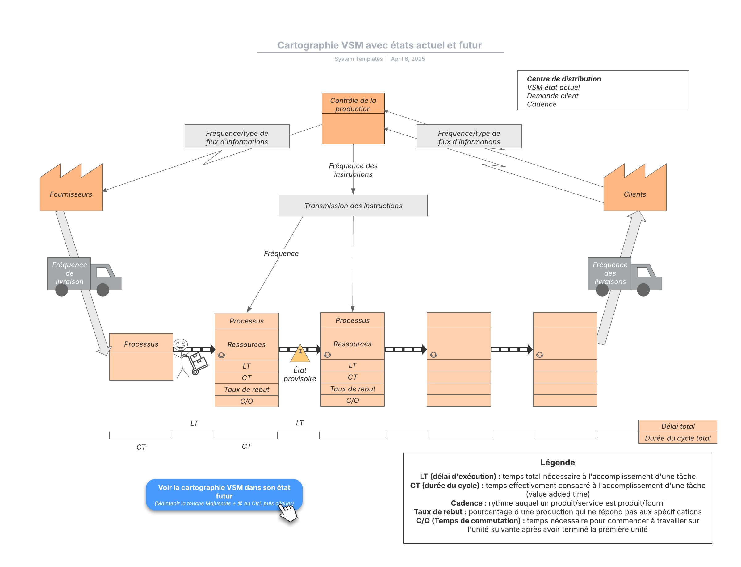 - basculer entre les états actuel et futur de votre chaîne de valeur orientée produit.