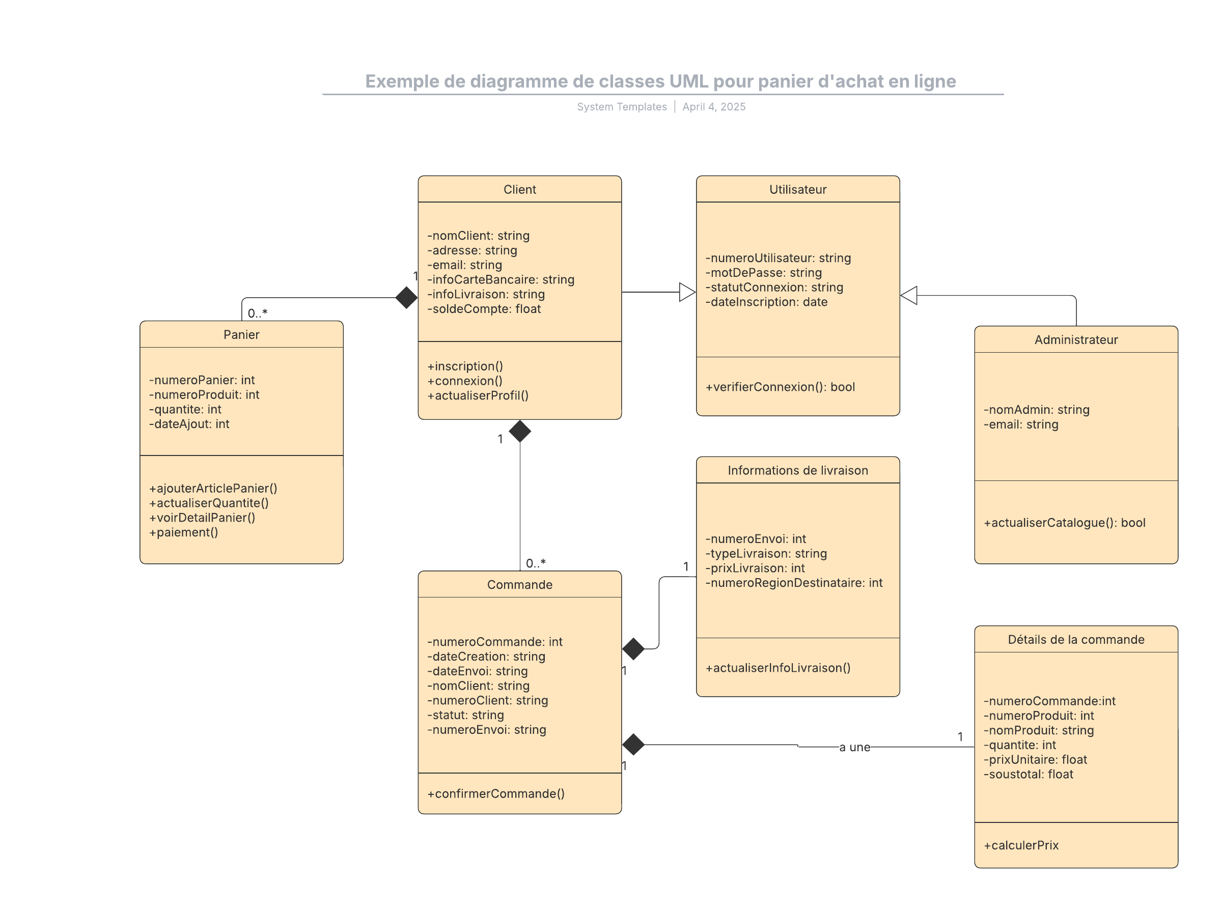 Ouvrez ce modèle pour visualiser un exemple détaillé de diagrammes de classes UML pour panier d'achat que vous pouvez personnaliser selon votre cas d'utilisation.