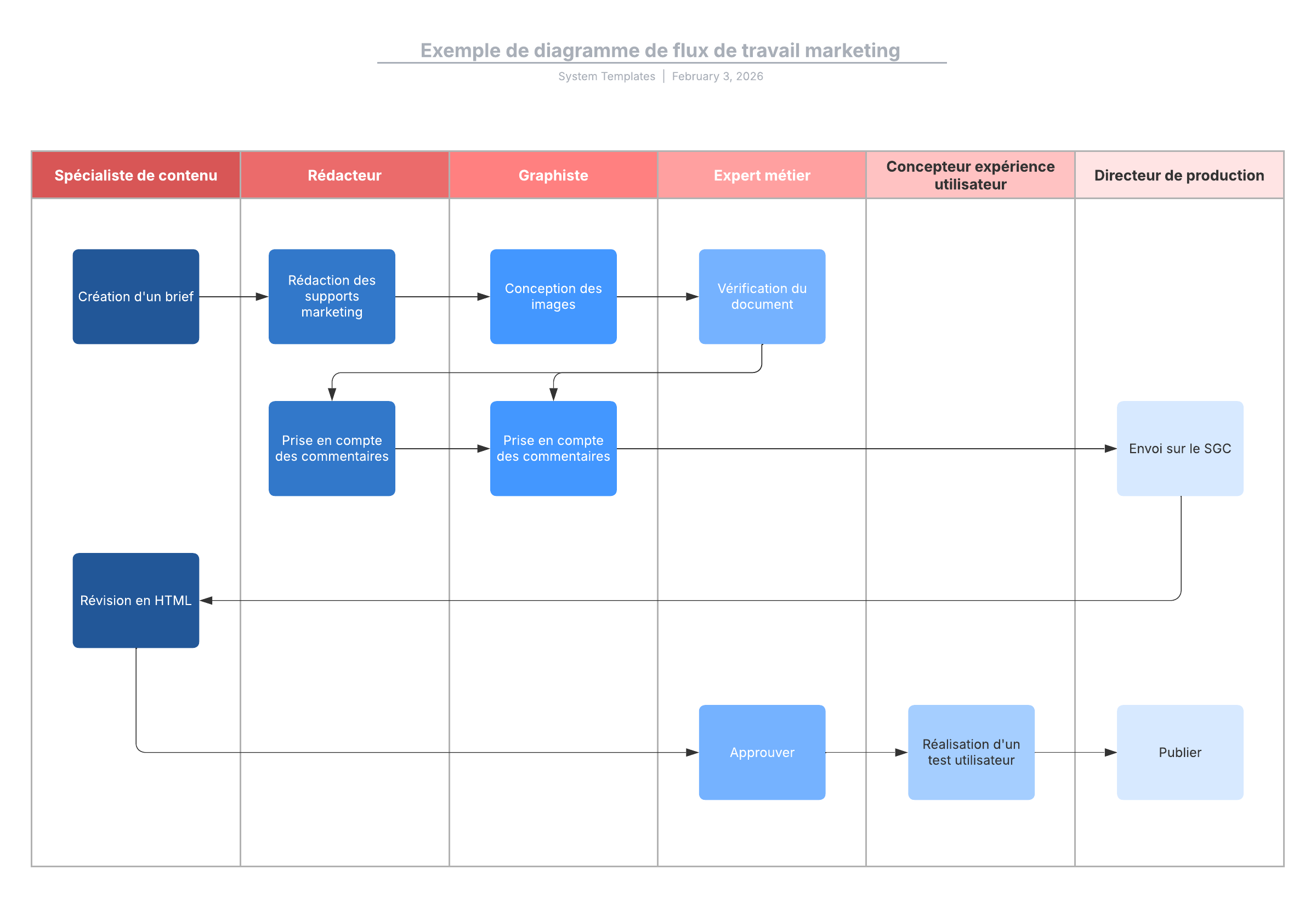 Ouvrez ce modèle pour visualiser un exemple détaillé d'un diagramme de flux de travail que vous pouvez personnaliser selon votre cas d'utilisation.