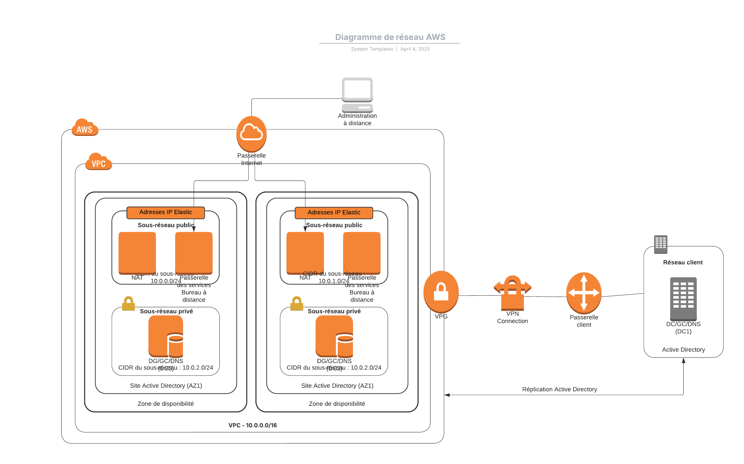 Ouvrez ce modèle pour accéder à un exemple détaillé de diagramme AWS que vous pouvez personnaliser selon votre cas d'utilisation.