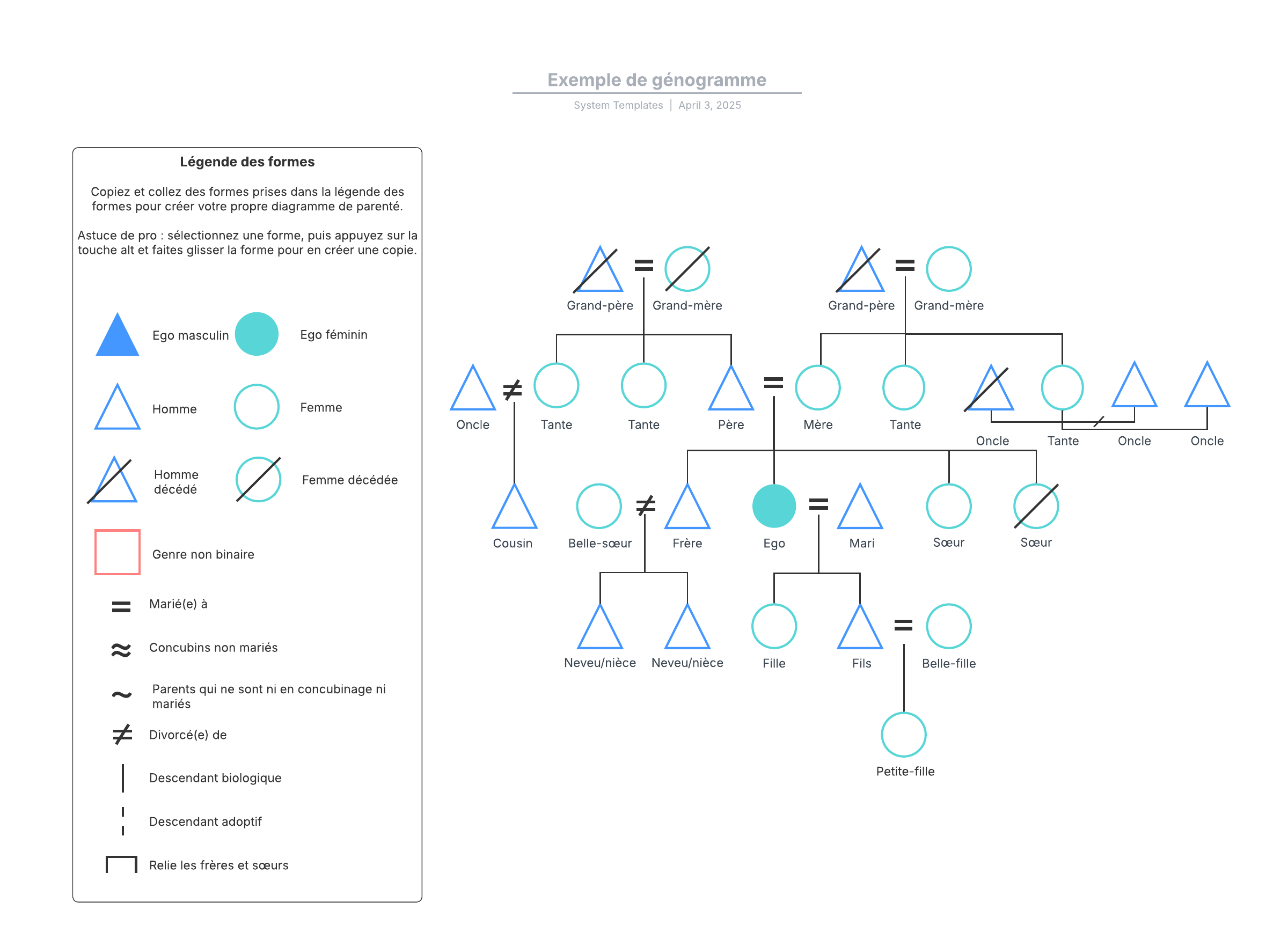 Ouvrez ce modèle pour visualiser un exemple détaillé de génogramme que vous pouvez personnaliser selon votre cas d'utilisation.