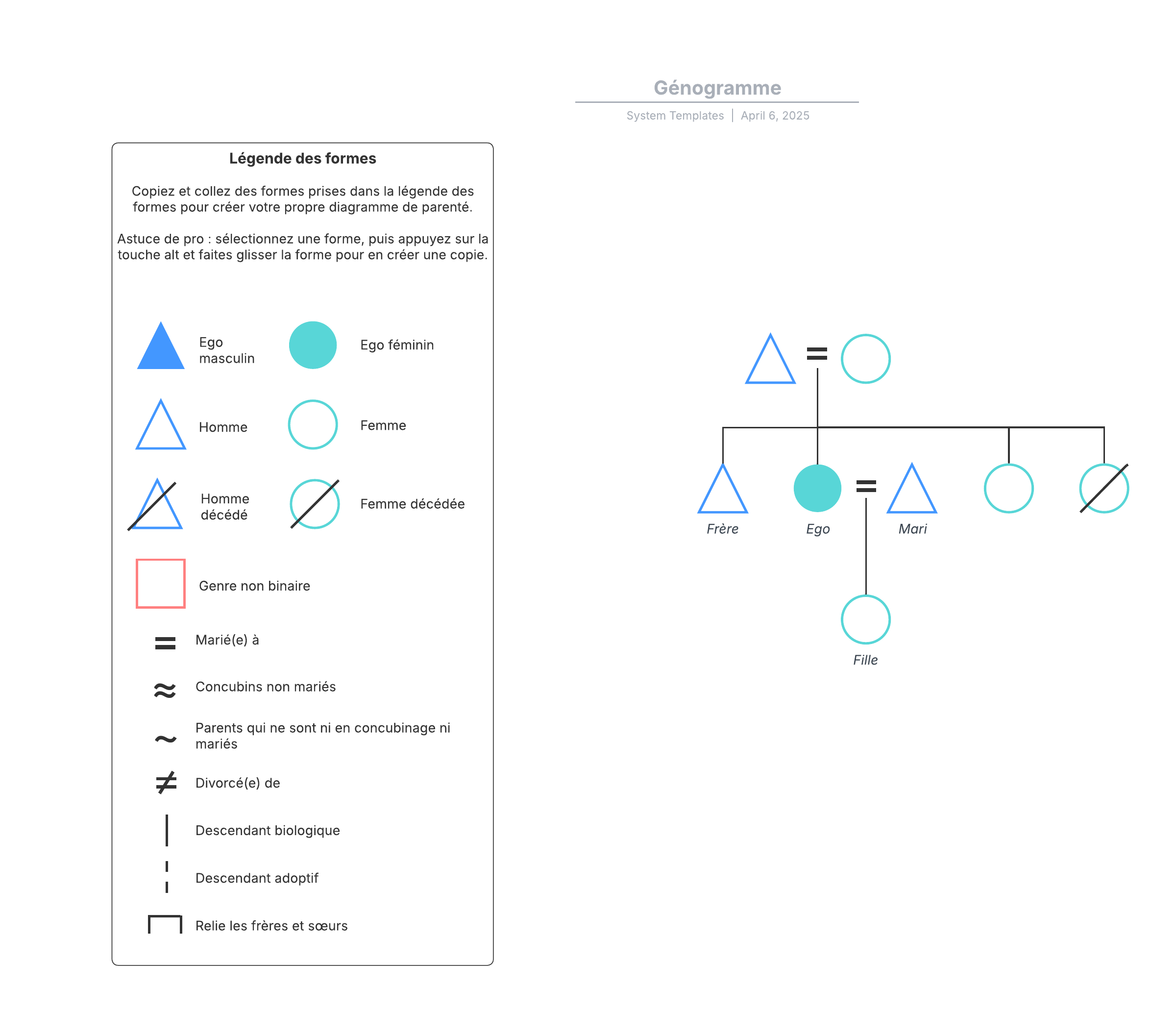 Ouvrez ce modèle de génogramme et ajoutez-y du contenu pour le personnaliser selon votre cas d'utilisation.