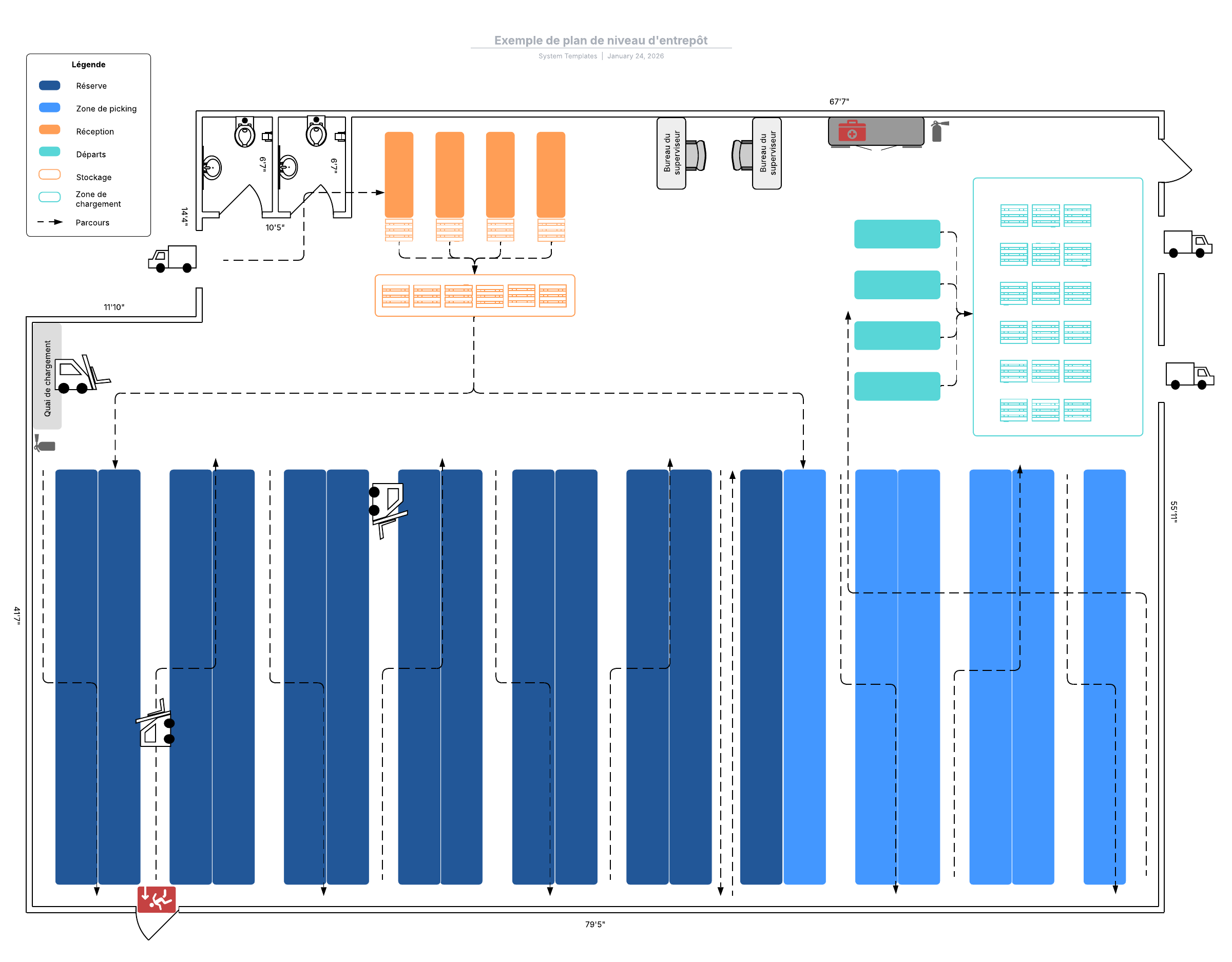 Ouvrez ce modèle pour afficher un exemple détaillé de plan de niveau d'entrepôt, à personnaliser selon votre cas d'utilisation.
