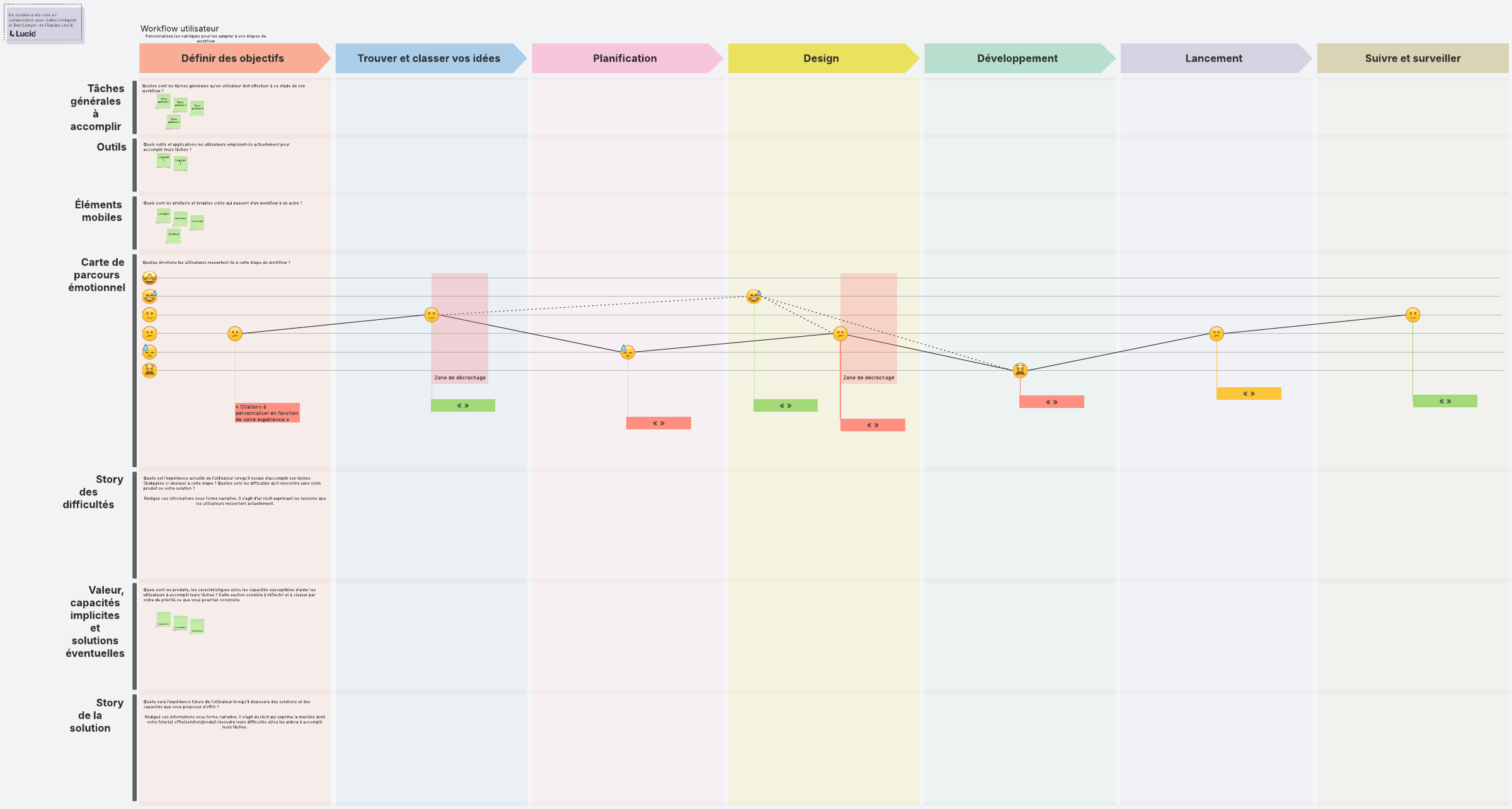 Le cadre de stratégie Fondamentaux produit de Lucid a été conçu pour vous accompagner dans votre recherche produit et stratégie. Mettez-vous à la place des utilisateurs pour identifier leurs besoins, leurs difficultés et leurs problèmes. Ensuite, organisez un brainstorming pour déterminer les capacités et les solutions à apporter à votre produit.