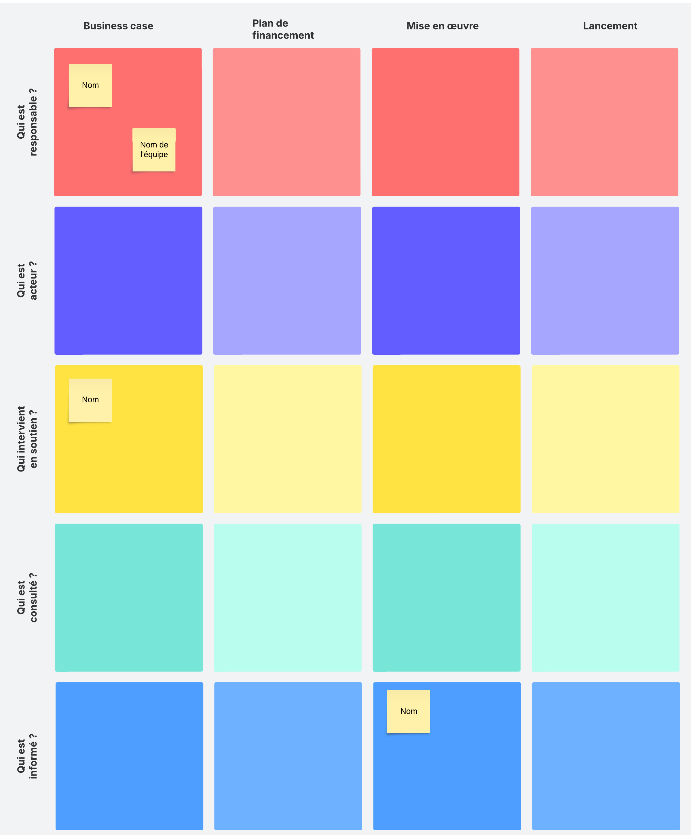 Obtenez une compréhension précise des responsabilités au sein de votre équipe en utilisant une matrice RASCI pour identifier les différents rôles de vos collaborateurs (responsable, acteur, soutien, consulté et informé).