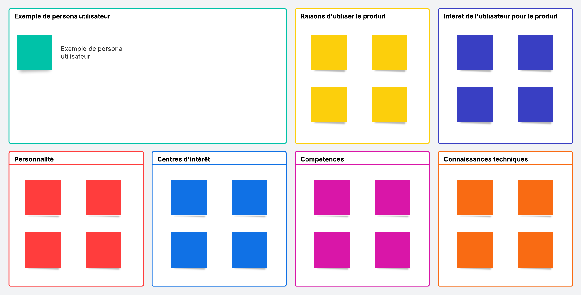 Découvrez ce qui fait vibrer votre public cible en créant un persona utilisateur. Remplissez ce modèle avec des détails et des informations pertinentes sur l'utilisateur puis partagez-le avec votre équipe pour que tous vos collaborateurs soient en phase.
