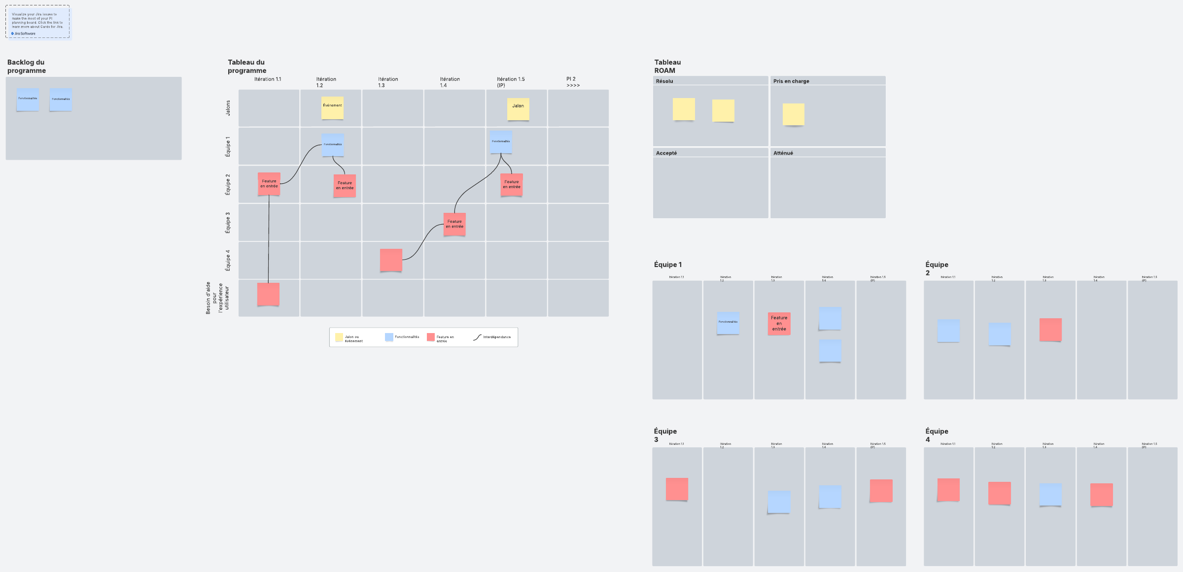 Utilisez ce modèle de planification pour réaliser votre Program Increment (PI) planning en ligne, mettre en œuvre le Scaled Agile Framework (SAFe), coordonner les efforts de vos équipes sur la prochaine période de lancements et visualiser la roadmap.