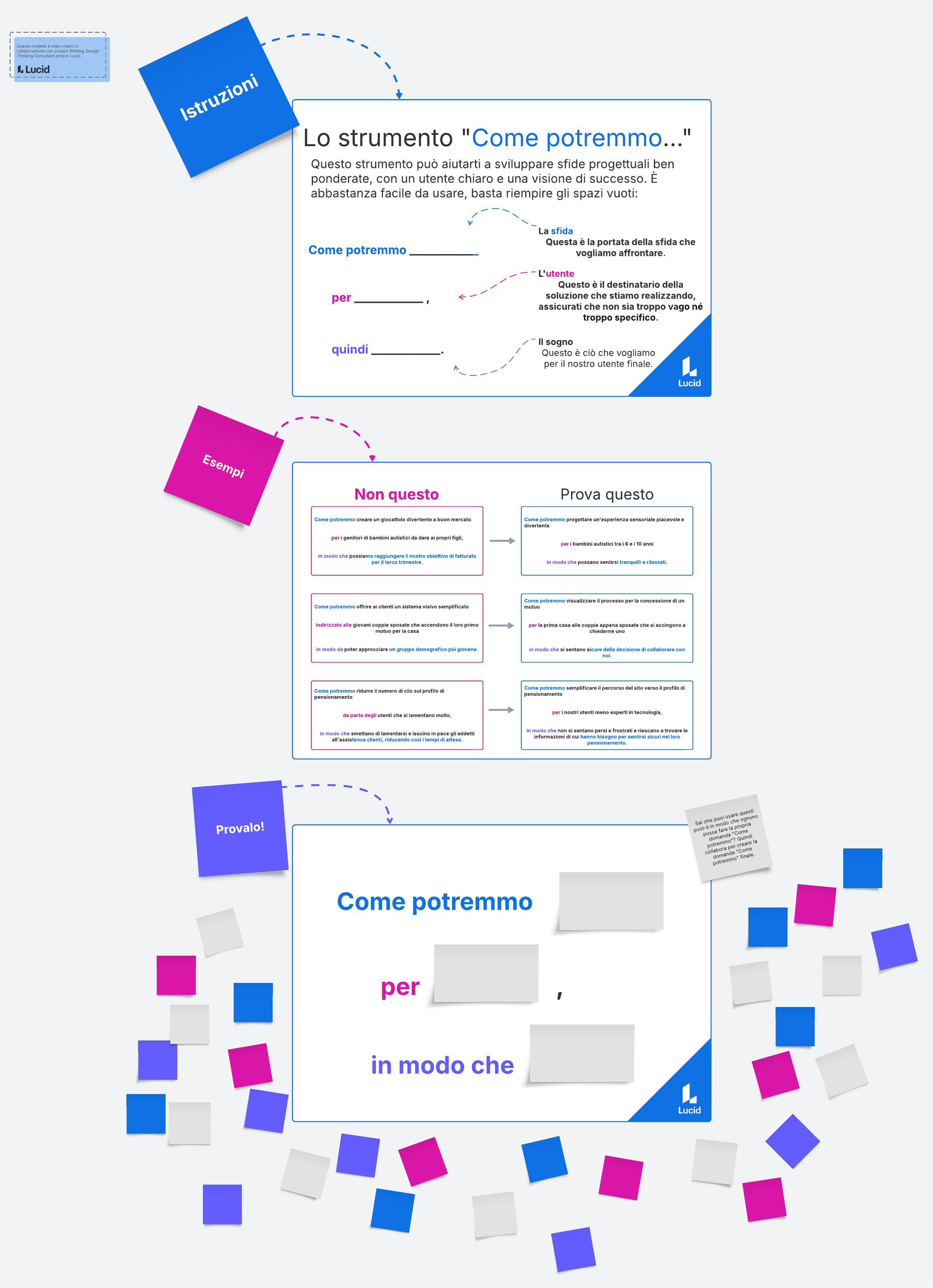 La domanda "come potremmo" è la quintessenza dello strumento di design thinking. Ha lo scopo di creare domande rigorose e significative per la sfida progettuale e di solito viene implementata al termine della fase di "definizione". Può essere utilizzata anche come elemento di riferimento prima di passare alla fase di "ideazione".