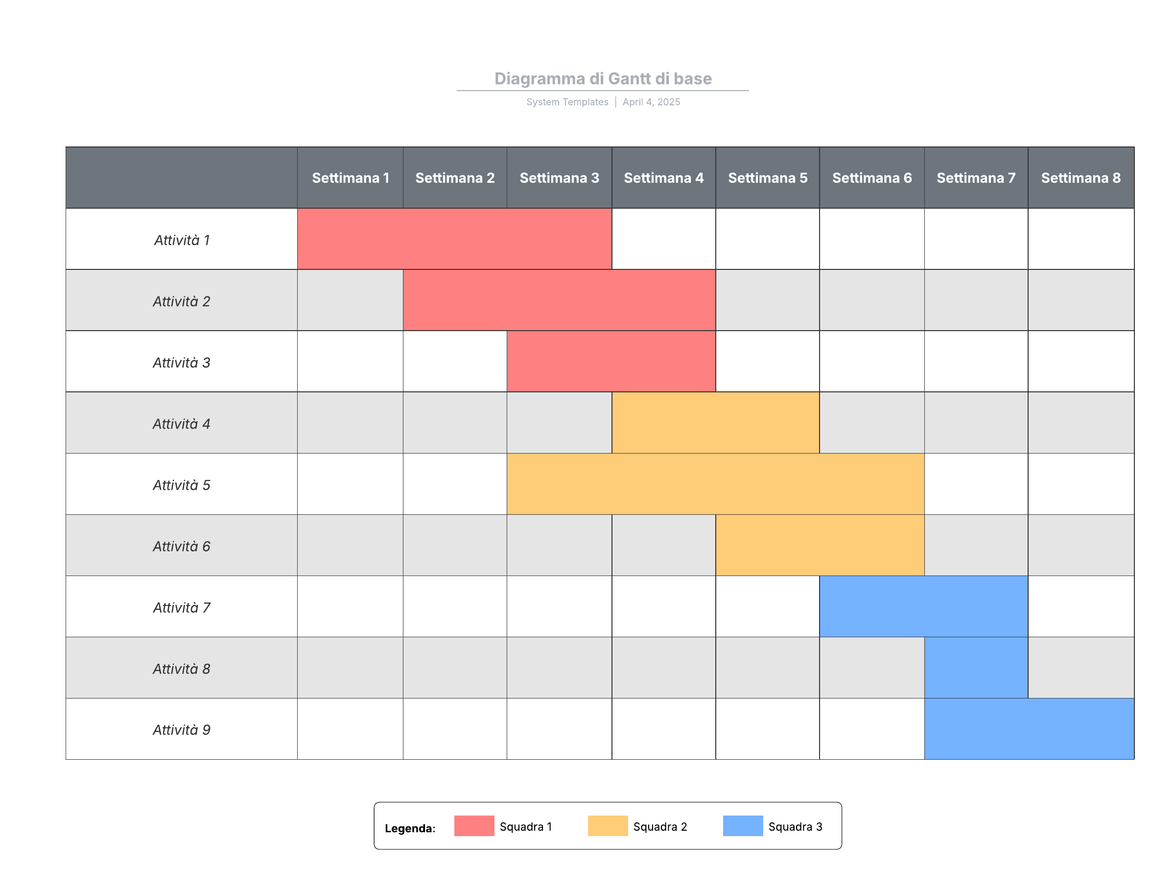 Apri questo modello per visualizzare un esempio dettagliato di un diagramma di Gantt di base, che puoi personalizzare in base al tuo caso d'uso.