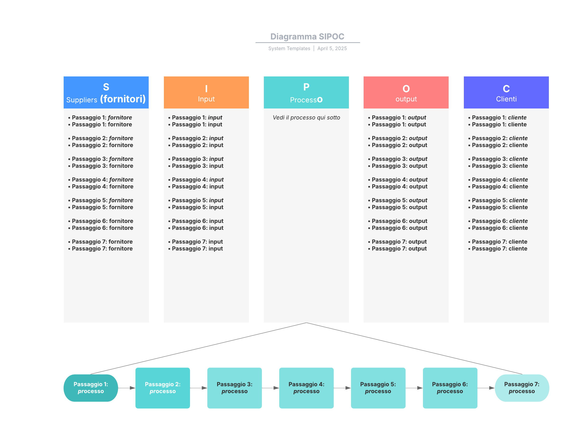 Apri questo modello e aggiungi contenuti per adattare questo diagramma SIPOC di base al tuo caso d'uso.