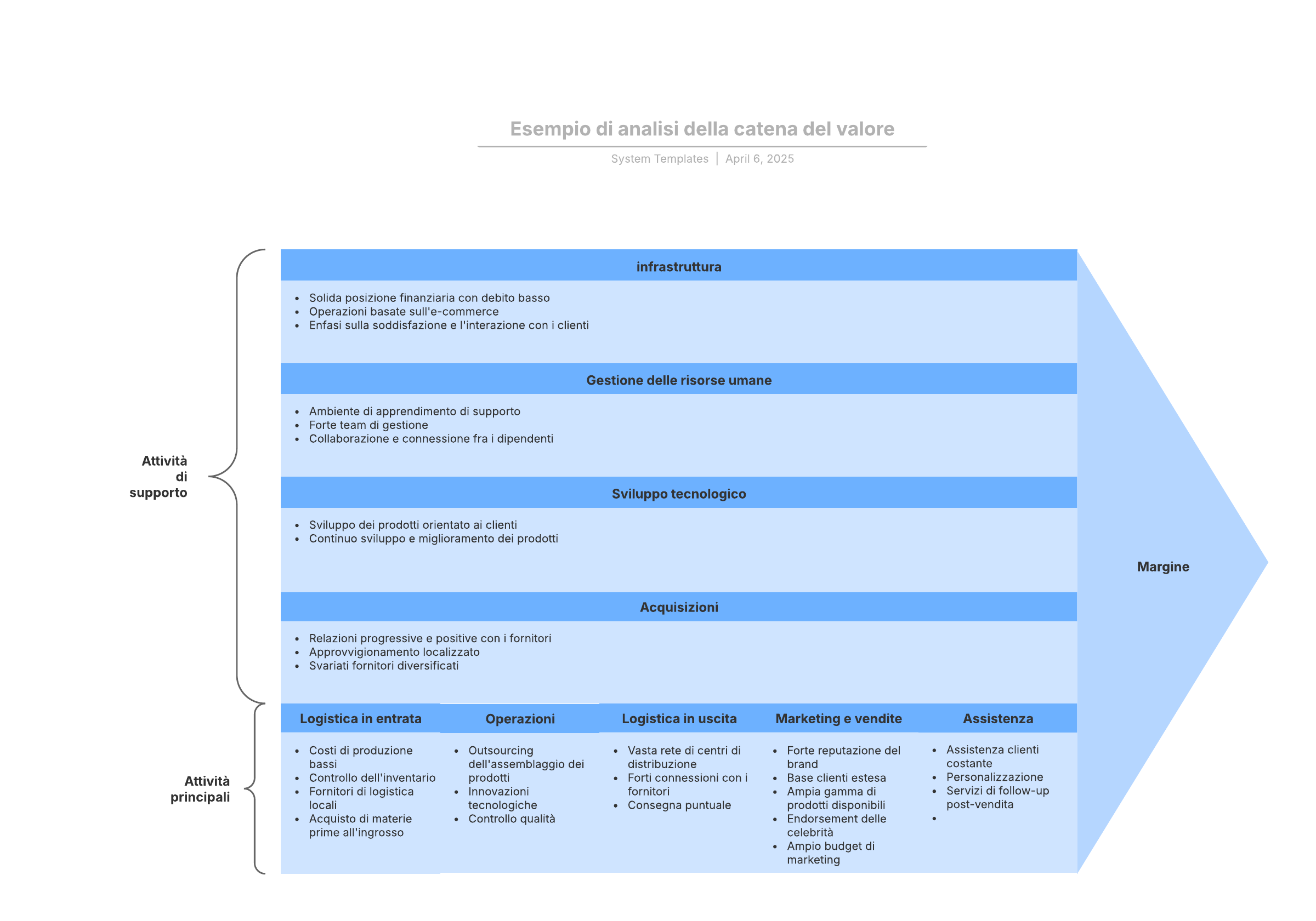 Apri questo modello per visualizzare un esempio dettagliato di analisi della catena del valore, che puoi personalizzare in base alle tue esigenze.