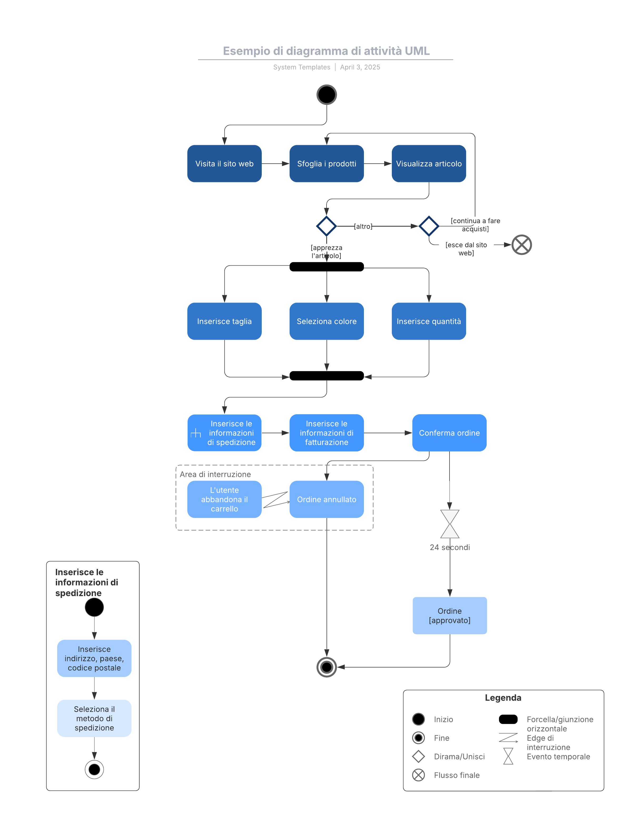 Apri questo modello per visualizzare l'esempio dettagliato di un diagramma di attività UML, che puoi personalizzare in base al tuo caso d'uso.