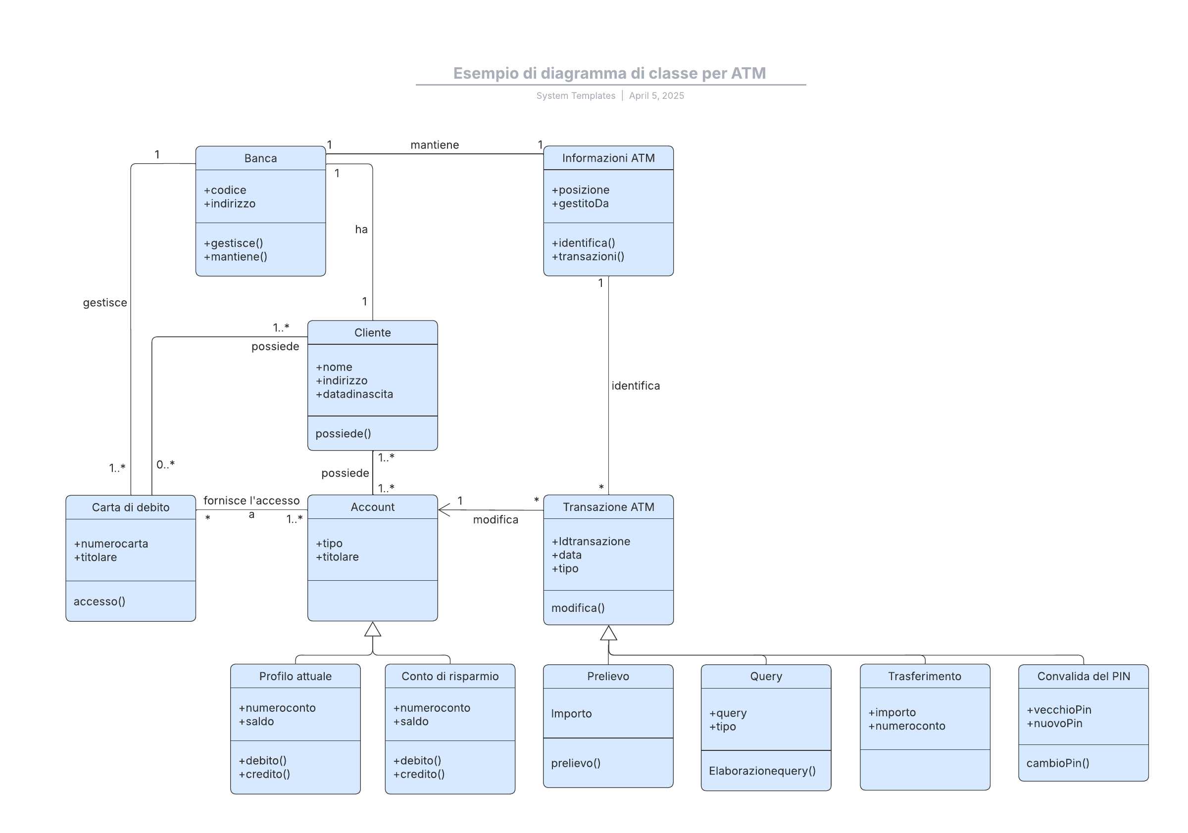 Apri questo modello per visualizzare l'esempio dettagliato di un diagramma di classe per ATM, che puoi personalizzare in base al tuo caso d'uso.