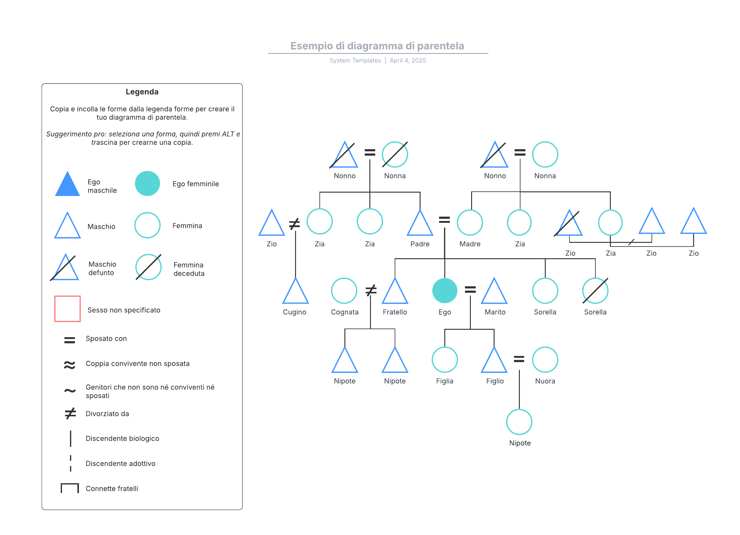 Apri questo modello per visualizzare l'esempio dettagliato di un diagramma di parentela, che puoi personalizzare in base al tuo caso d'uso.