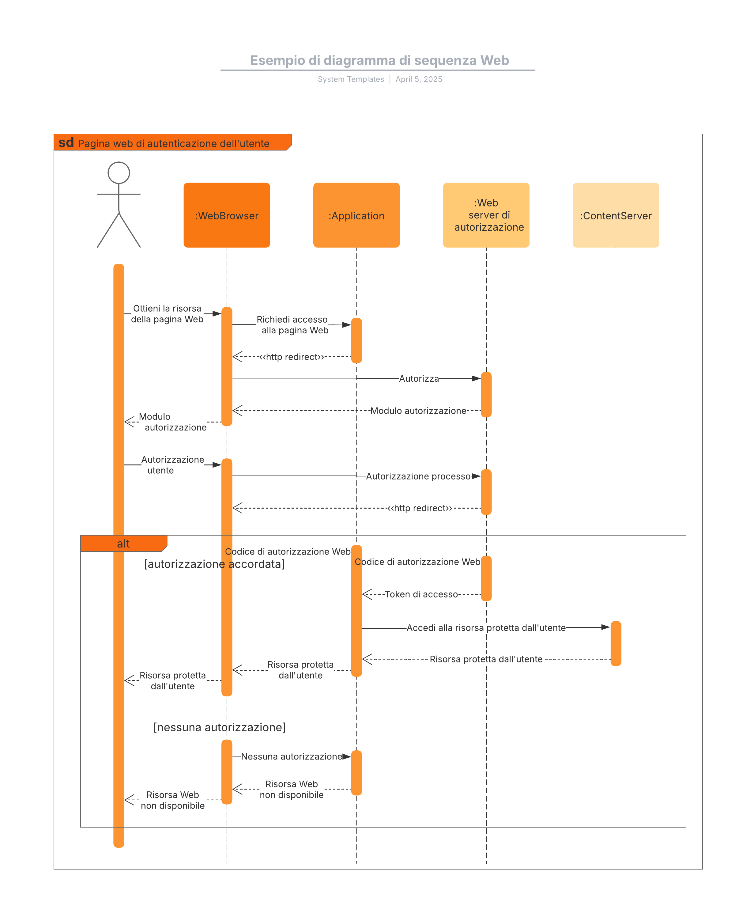 Apri questo modello per visualizzare un esempio dettagliato di un diagramma di sequenza, che puoi personalizzare in base al tuo caso d'uso.