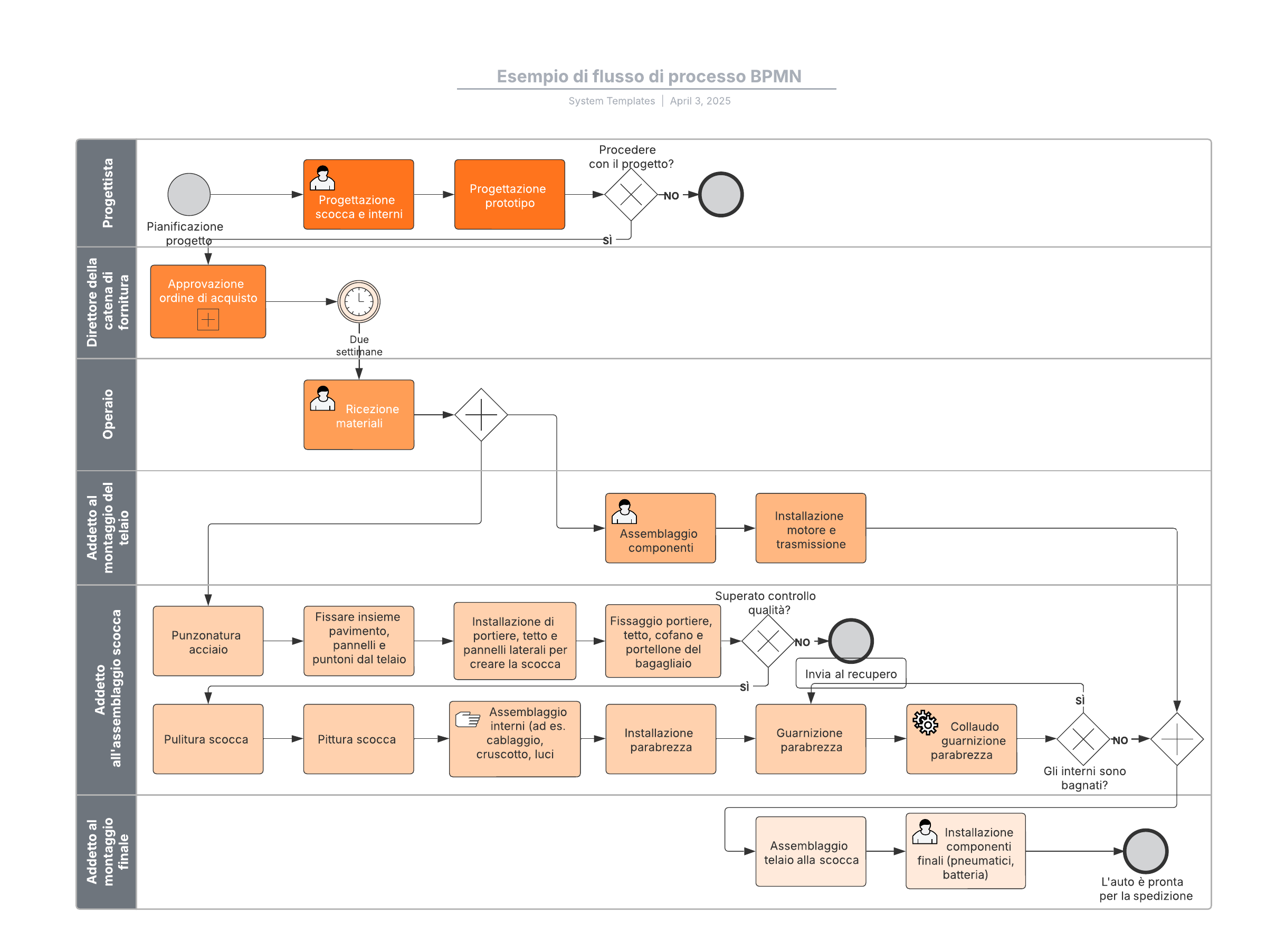 Apri questo modello per visualizzare un esempio dettagliato di diagramma di flusso di processo BPMN, che puoi personalizzare in base al tuo caso d'uso.