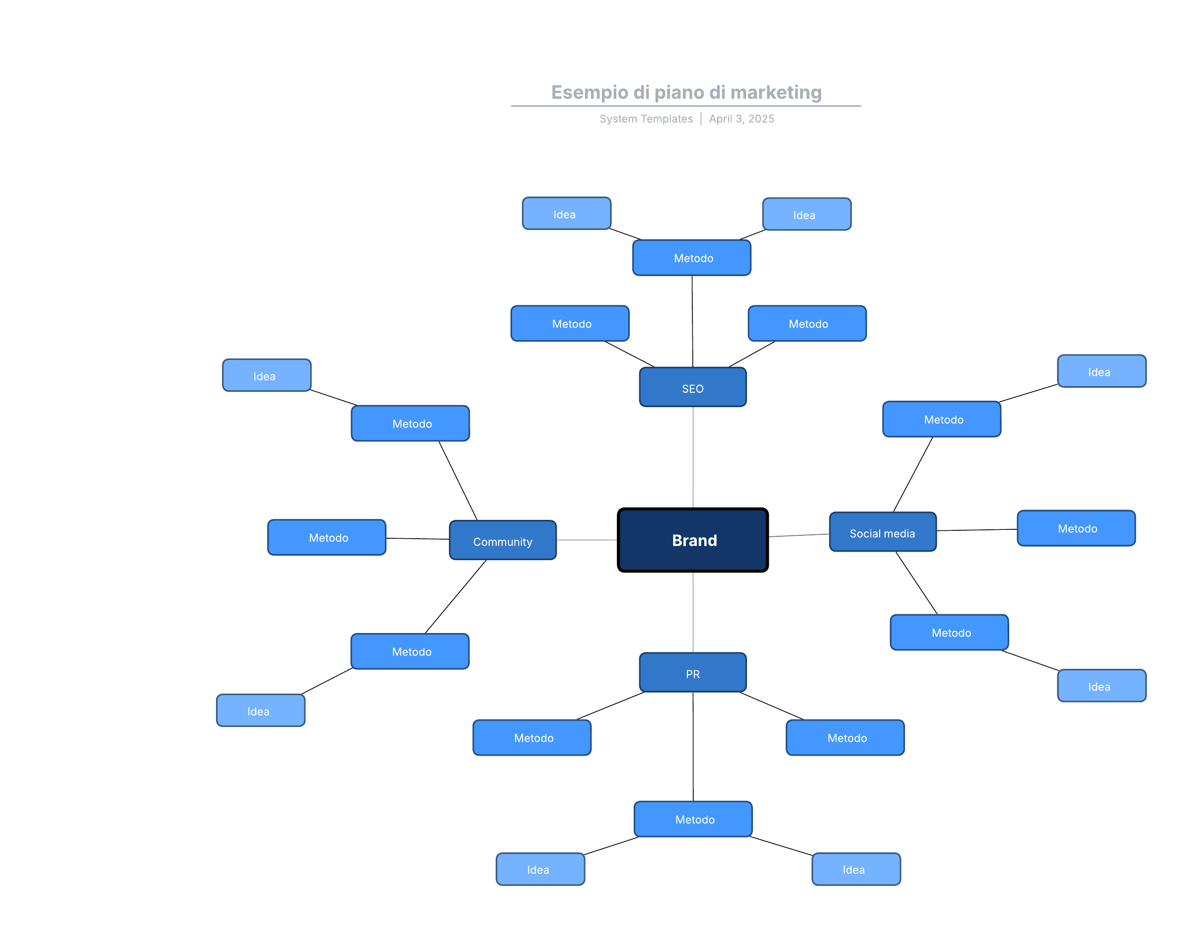 Apri questo modello per visualizzare l'esempio dettagliato di un diagramma di piano di marketing, che puoi personalizzare in base al tuo caso d'uso.