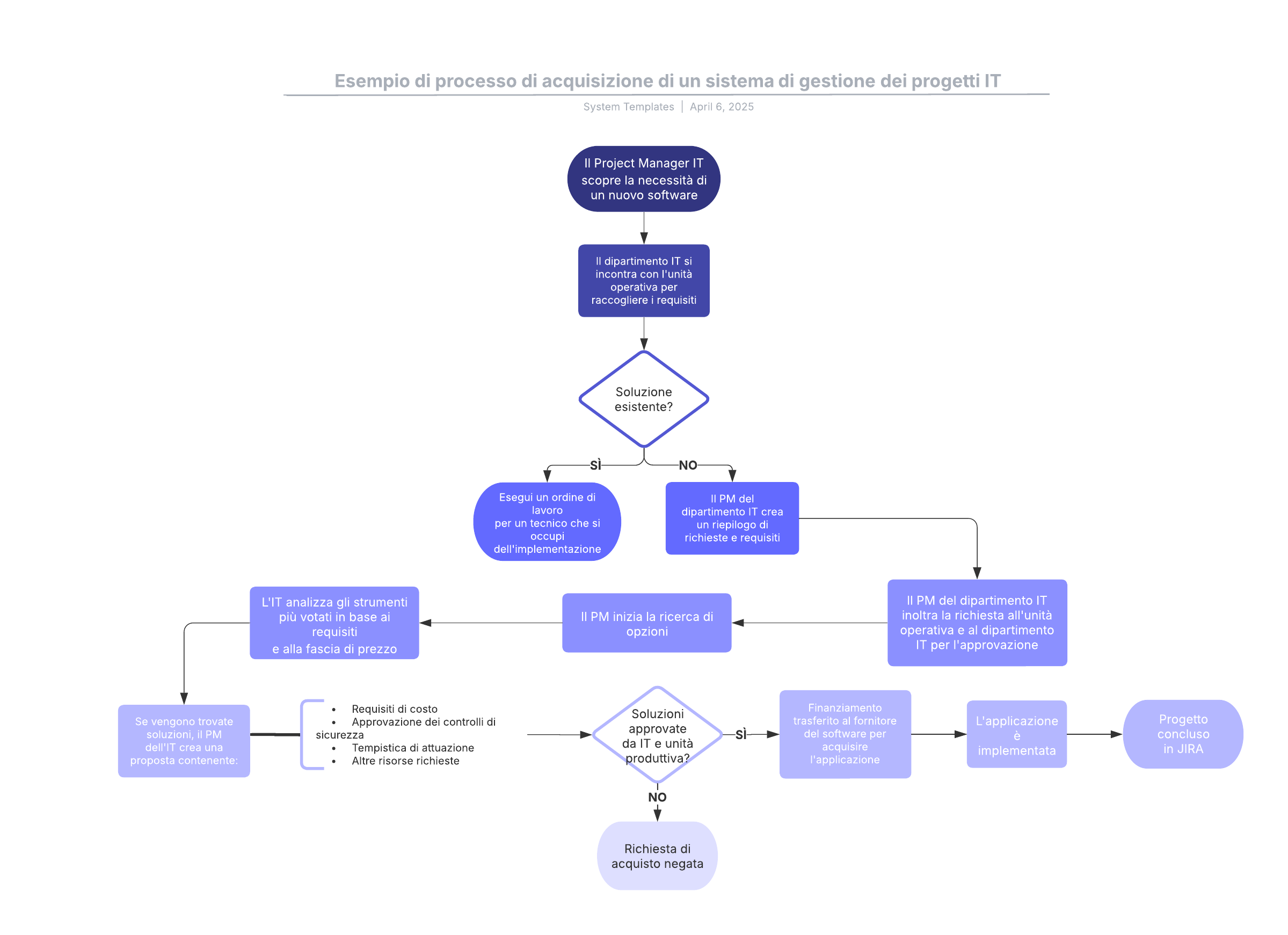 Apri questo modello per visualizzare un esempio dettagliato di un processo di acquisizione di un sistema di gestione dei progetti IT, che puoi personalizzare in base al tuo caso d'uso.