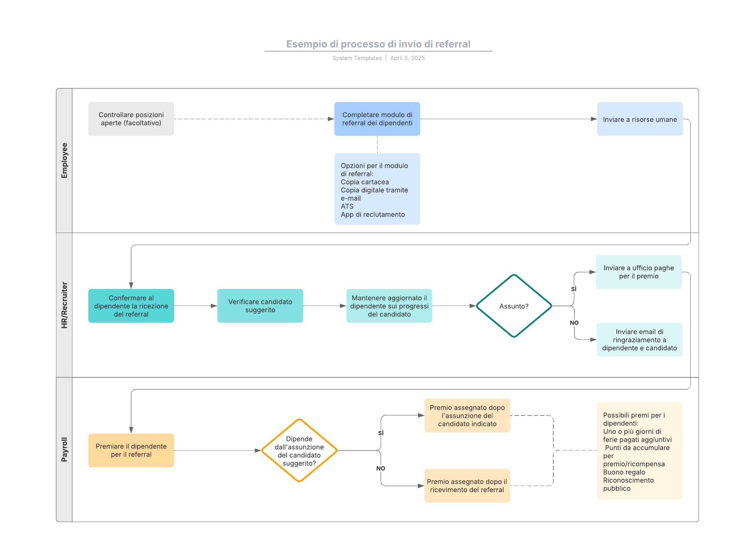 - Chiarire il processo e la tempistica dei premi per reclutatori/risorse umane e organico/personale.