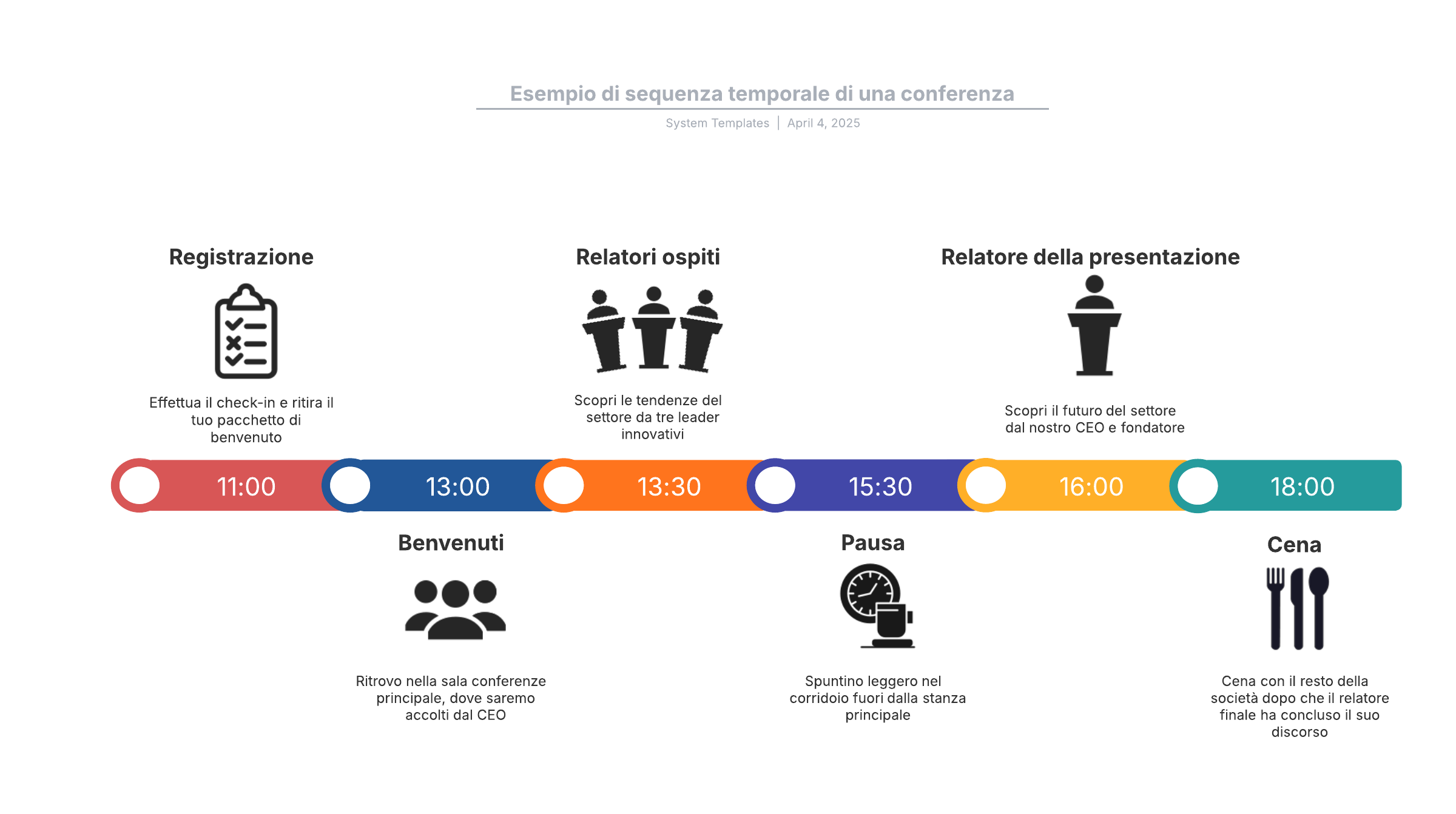 Apri questo modello per visualizzare un esempio dettagliato di una sequenza temporale di una conferenza, che puoi personalizzare in base al tuo caso d'uso.