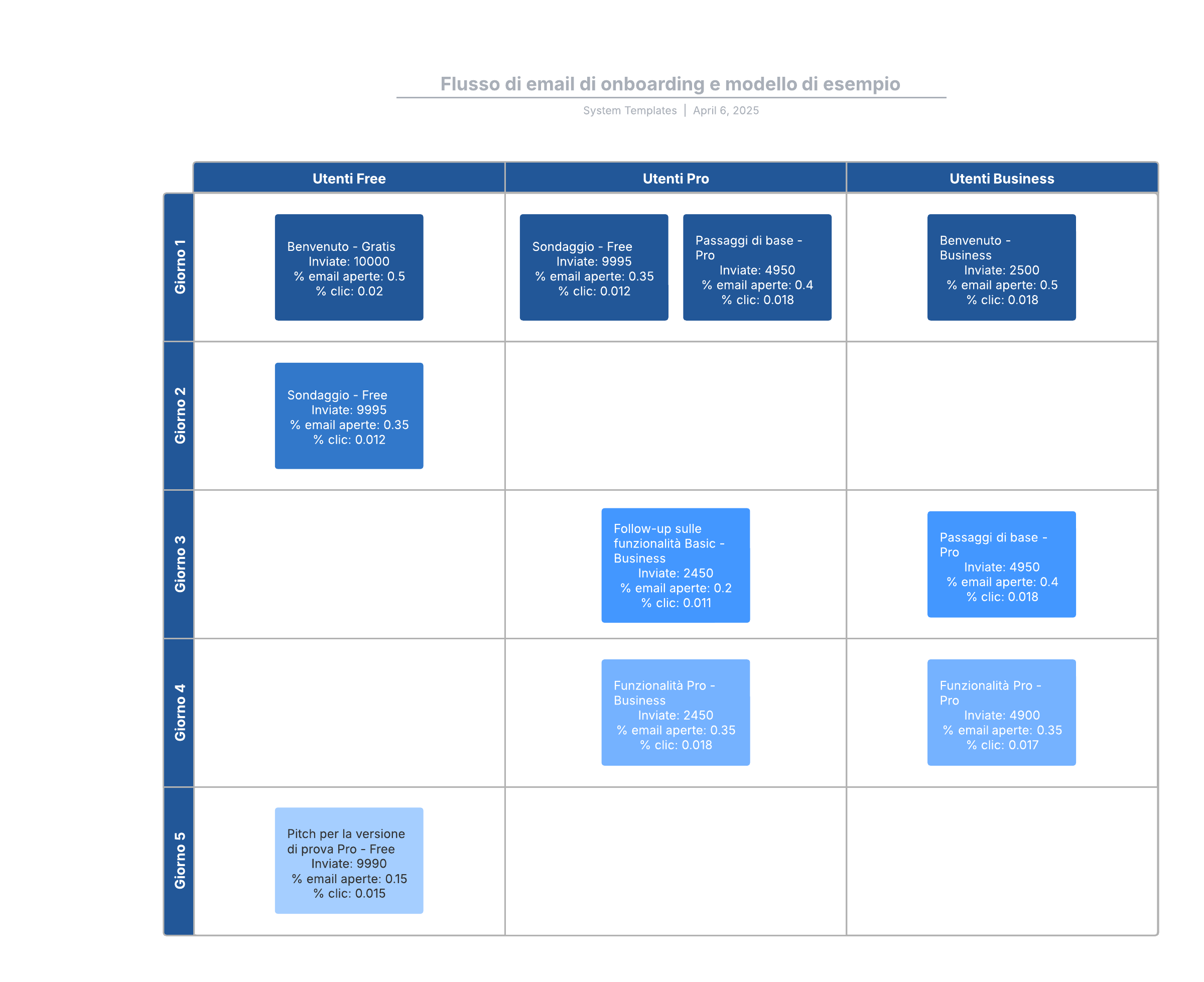 Apri questo modello per visualizzare un esempio dettagliato di un flusso di email di onboarding con modello, che puoi personalizzare in base al tuo caso d'uso.