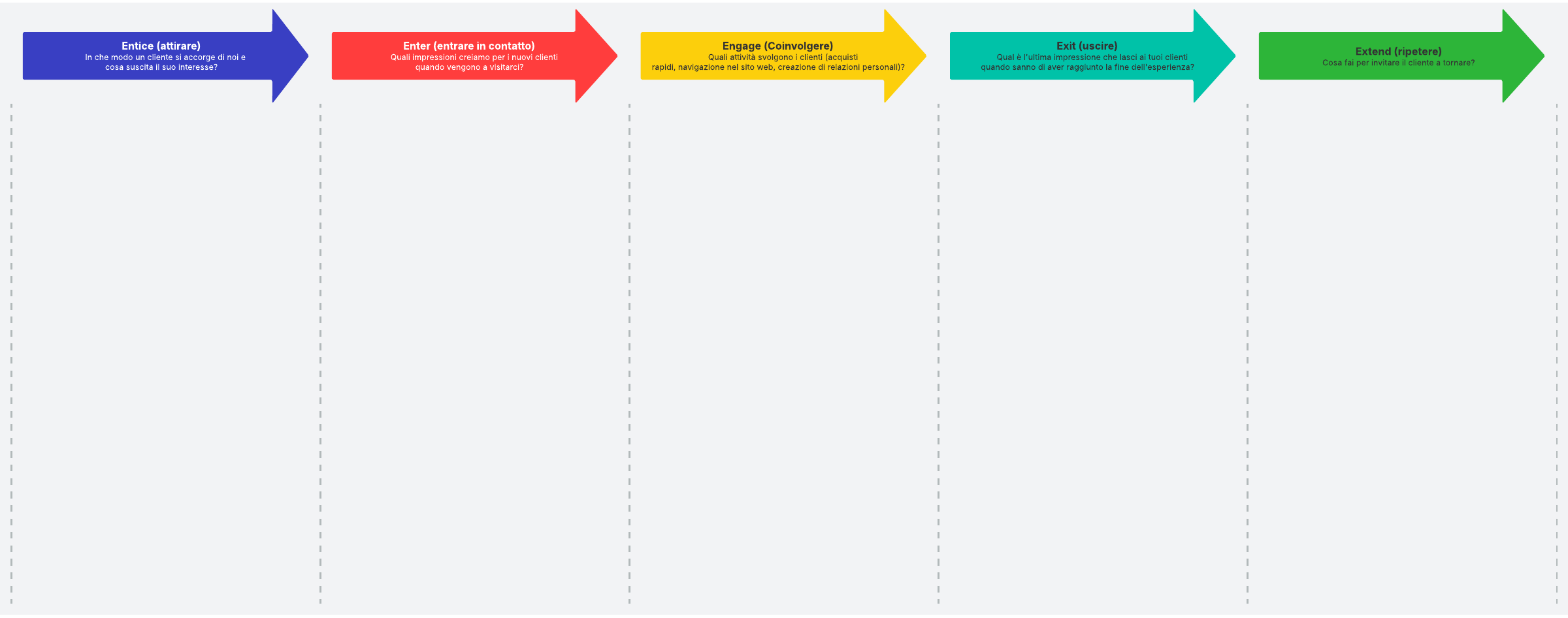 Comprendere le sensazioni e le interazioni dei clienti con il tuo prodotto è fondamentale per migliorare l'esperienza del cliente e promuovere la fidelizzazione. Usa questa mappa del percorso del cliente con le 5 E per esplorare le esperienze del cliente nelle cinque fasi seguenti: Entice (attirare), Enter (entrare in contatto), Engage (coinvolgere), Exit (uscire) e Extend (ripetere).