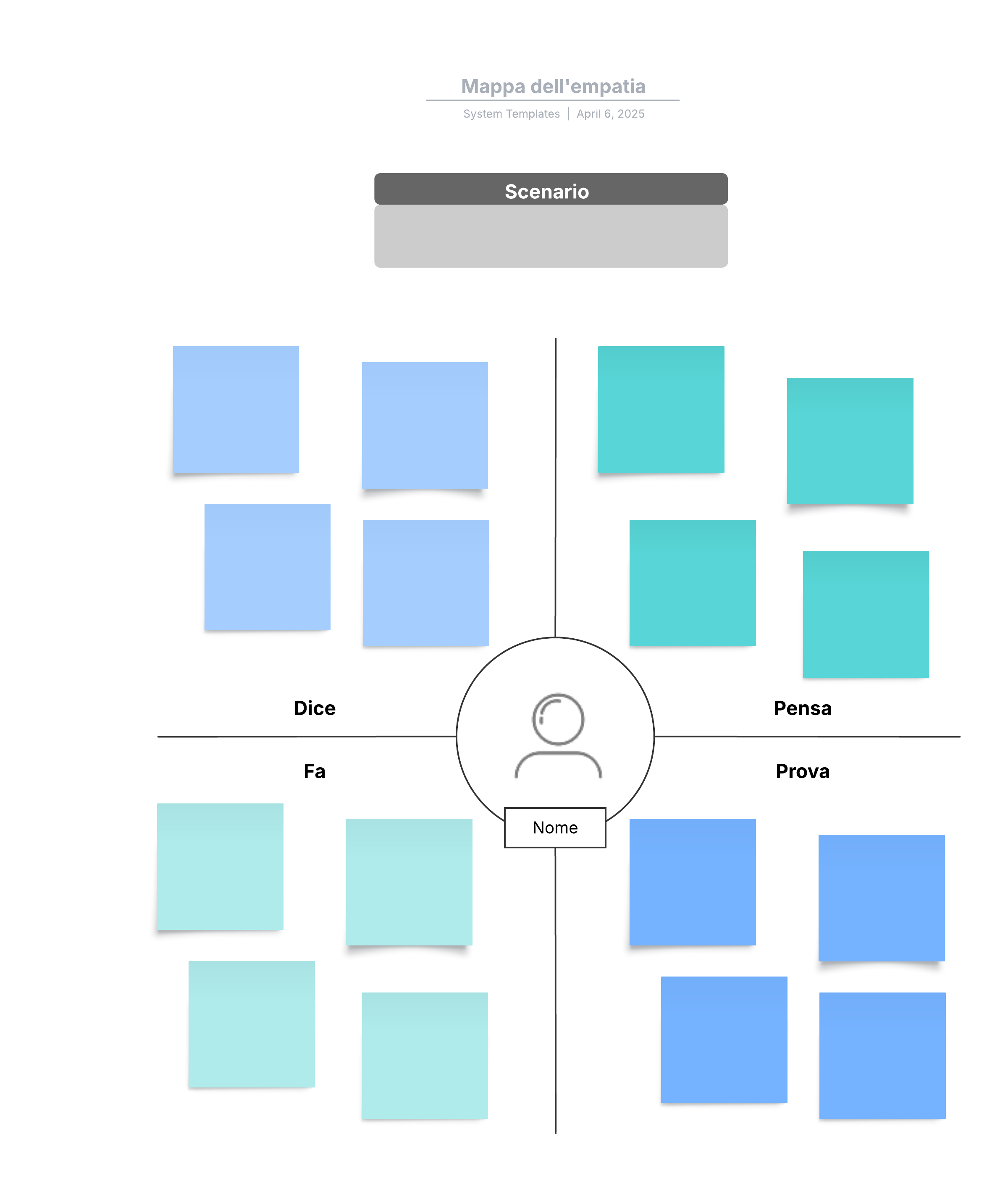 Apri questo modello e aggiungi contenuti per adattare questa mappa di empatia vuota al tuo caso d'uso.