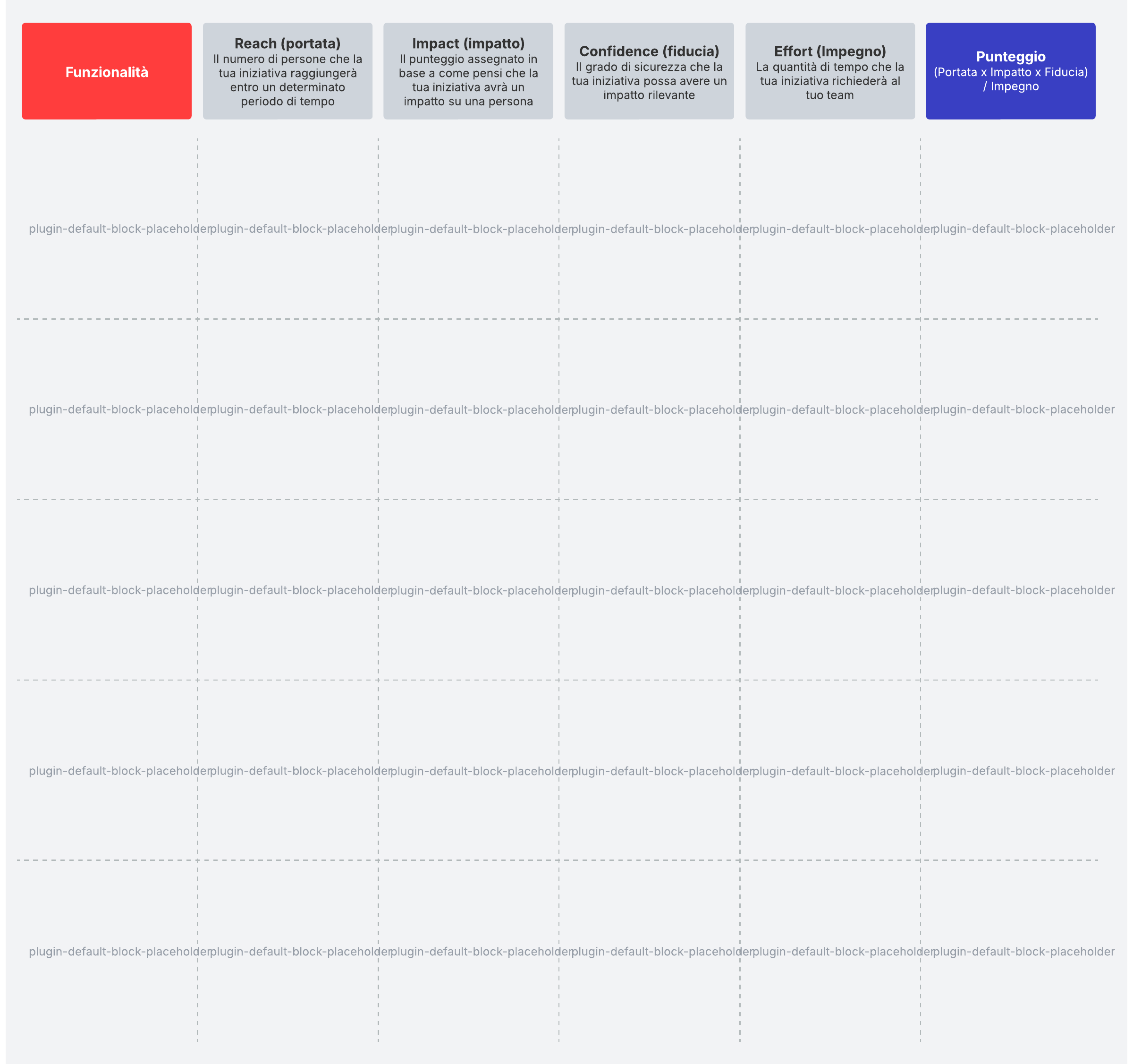 Assegna priorità ai prodotti o alle funzionalità da aggiungere alla tua roadmap attribuendo loro un punteggio in base a quattro fattori: Reach (portata), Impact (impatto), Confidence (fiducia) ed Effort (impegno).