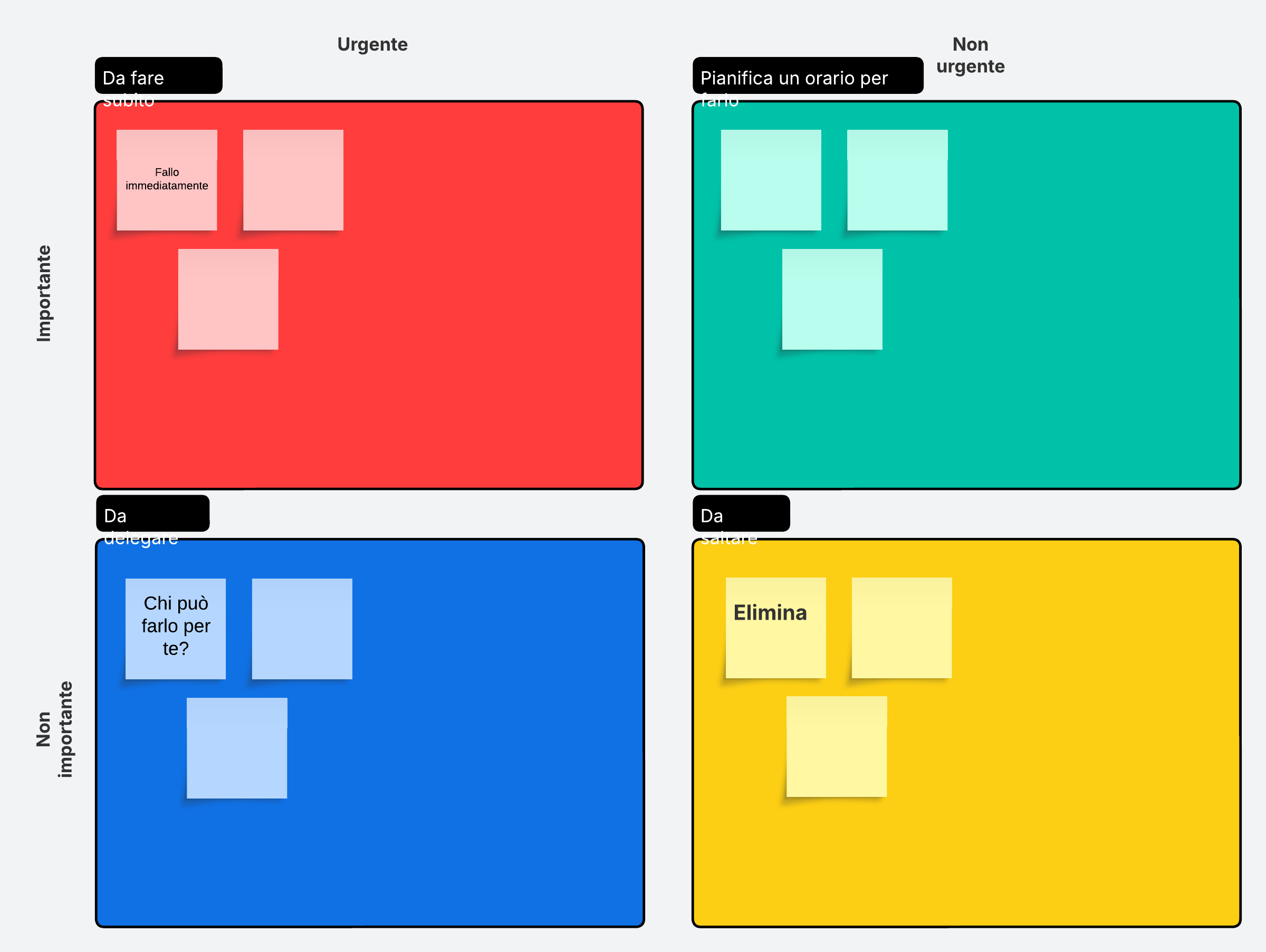 Definisci la priorità delle attività utilizzando questa matrice di Eisenhower. Organizza le attività in base all'urgenza e all'importanza per chiarire quali devono essere eseguite ora, quali possono aspettare e quali possono essere delegate.