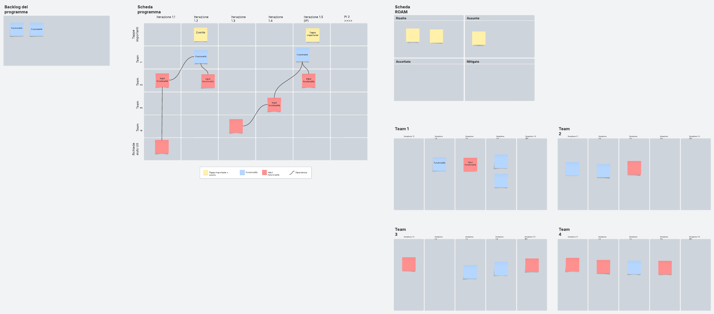 Porta online la tua pianificazione del Program Increment (PI). Utilizza questa scheda di pianificazione per implementare lo Scaled Agile Framework (SAFe), mantenere i team coordinati per il prossimo periodo di release e visualizzare la roadmap.