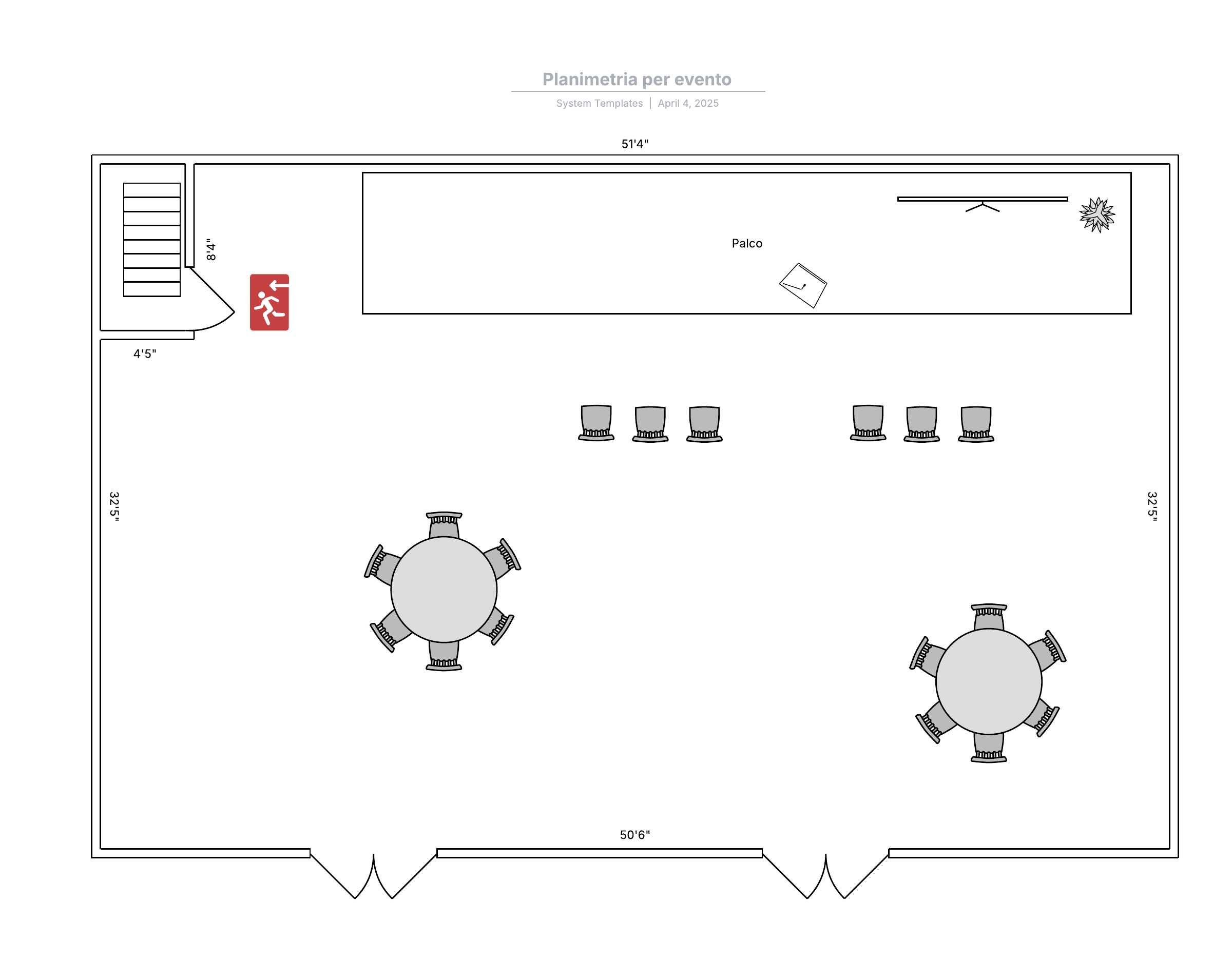 Apri questo modello e aggiungi contenuti per adattare questo diagramma di planimetria per saloni eventi di base al tuo caso d'uso.