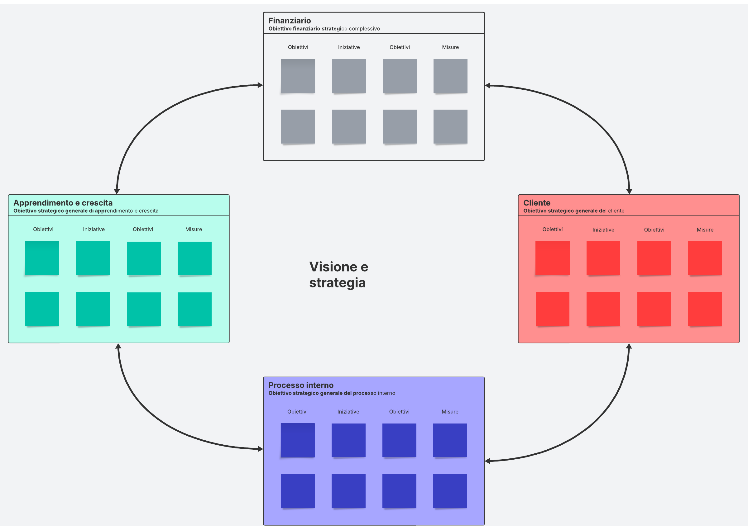 Utilizza una scheda di valutazione equilibrata per definire i tuoi obiettivi strategici, sviluppare una visione globale per la tua organizzazione e suddividere gli obiettivi in piccole iniziative misurabili. Questa scheda di valutazione si concentra su quattro prospettive aziendali principali: cliente, finanze, processo aziendale interno e apprendimento e crescita.