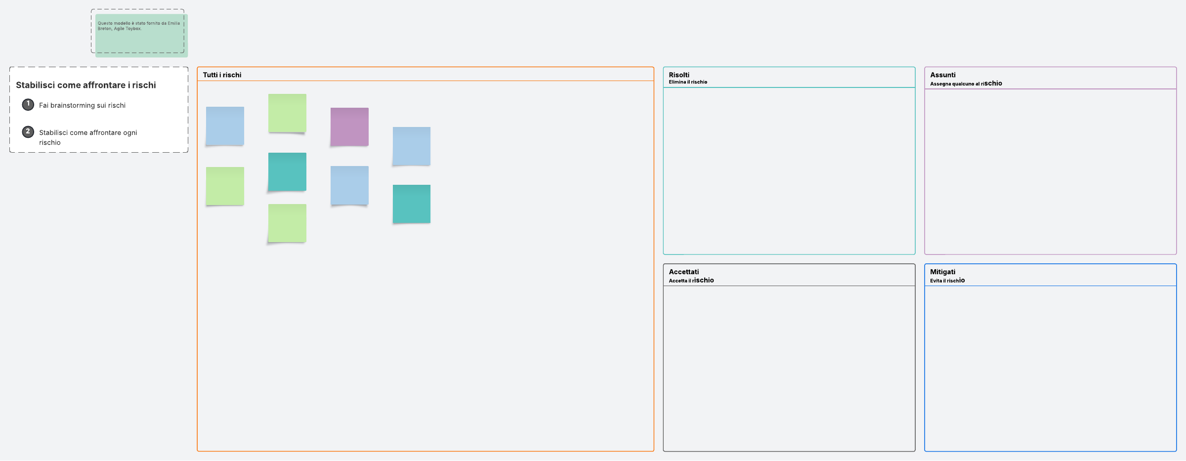 Crea un piano d'azione per affrontare i rischi del team con questo modello di schema ROAM (Resolved, Owned, Accepted, Mitigated).