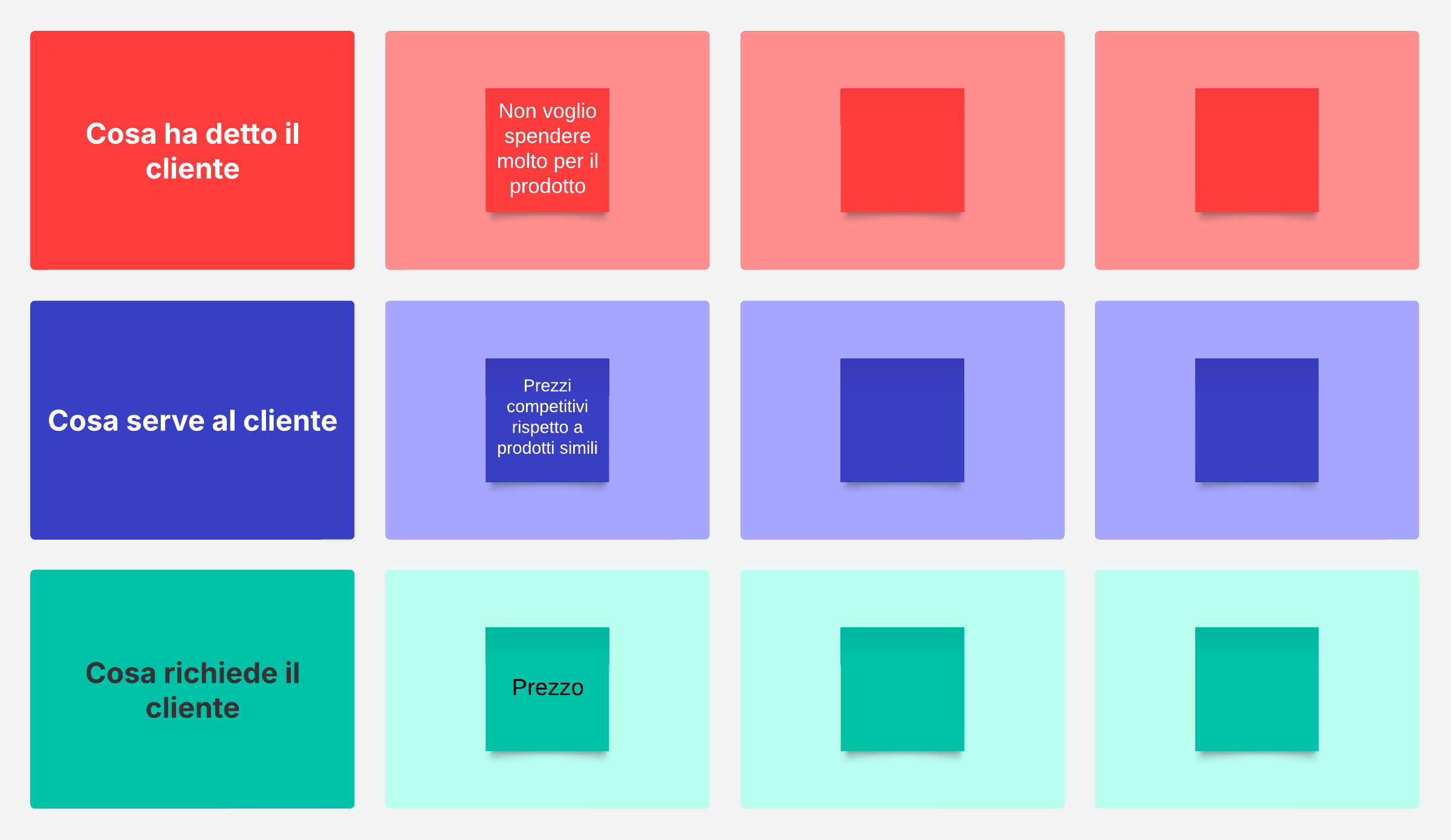 Questa matrice Voce del cliente consente di disporre di un grafico organizzato di ciò di cui i clienti hanno bisogno e si aspettano dal tuo prodotto o servizio.