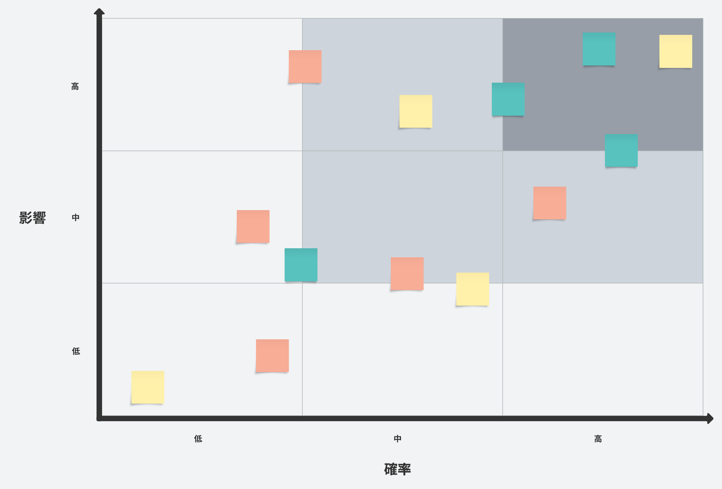 この3x3の優先順位付けマトリックスは、戦略的な決定を下すために使えます。項目間の関係を理解することで、取る価値のあるリスクとそうでないリスクに関し、チームとして戦略的な決定を下すのに役立つフレームワークを確立できます。
