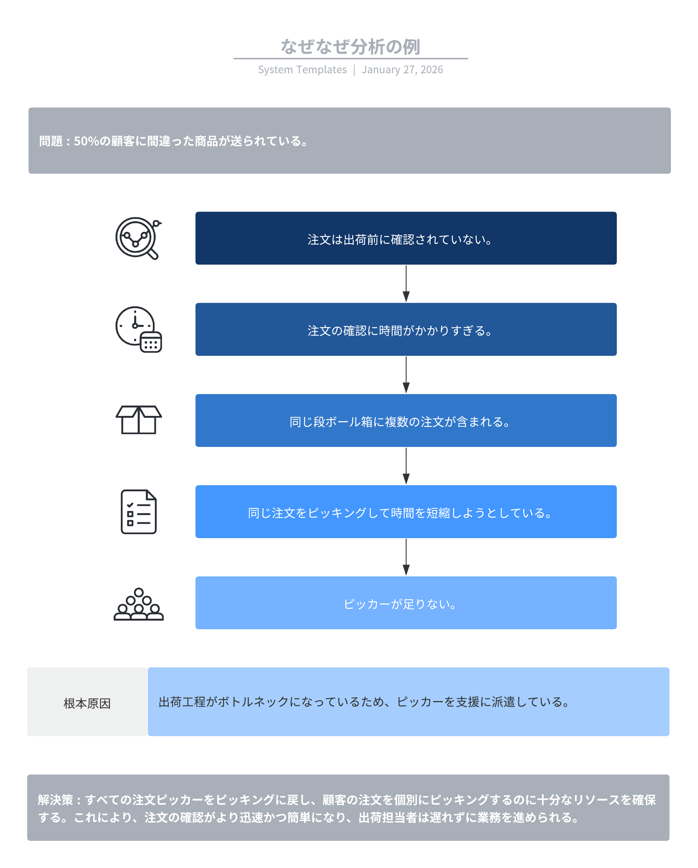 なぜなぜ分析 テンプレートは、この分析手法を実施する際に役立ちます。具体的には、以下のような用途に活用されます: