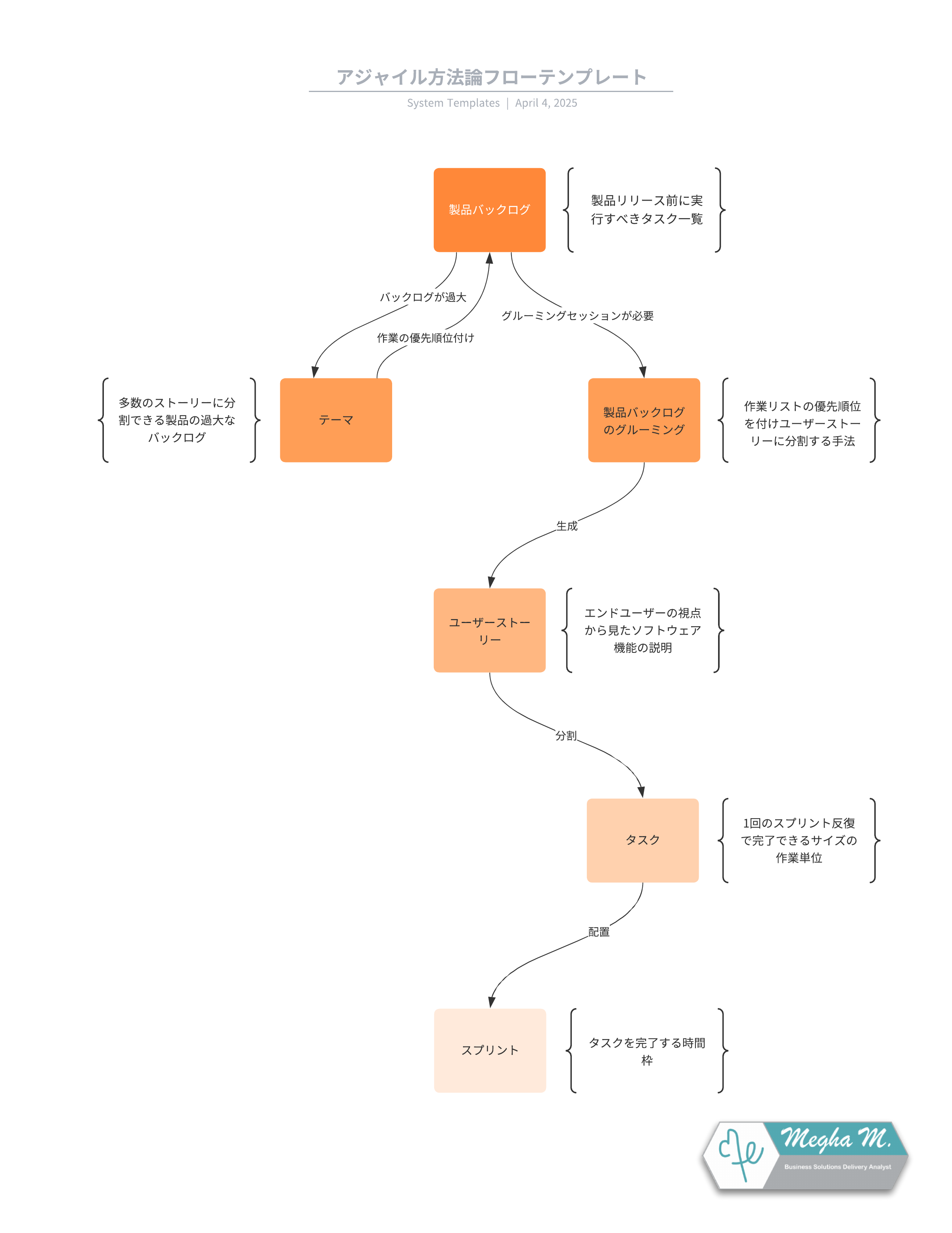 テンプレートを開き、ユースケースに合わせてカスタマイズ可能なアジャイル方法論フローの例を詳しく確認してみましょう。