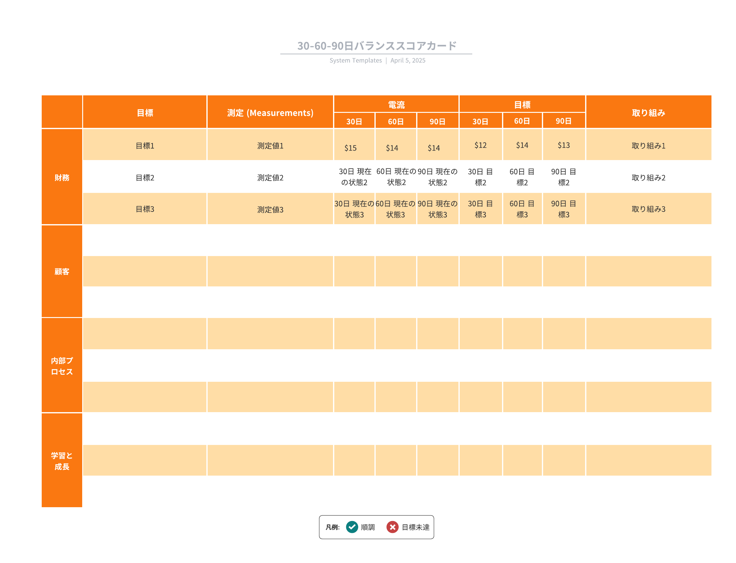 ユースケースに合わせてこのバランススコアカード図をカスタマイズするには、このテンプレートを開き、コンテンツを追加します。