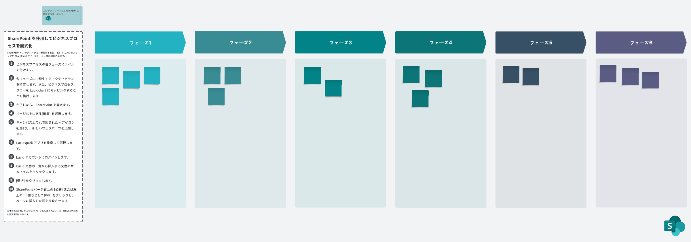 このテンプレートは、Lucidspark と SharePoint の連携機能を活用することで、誰でも簡単にビジネスプロセスマップを作成できるように設計されています。初心者でもすぐに使えるように、基本的な描き方や構成も分かりやすく解説されています。