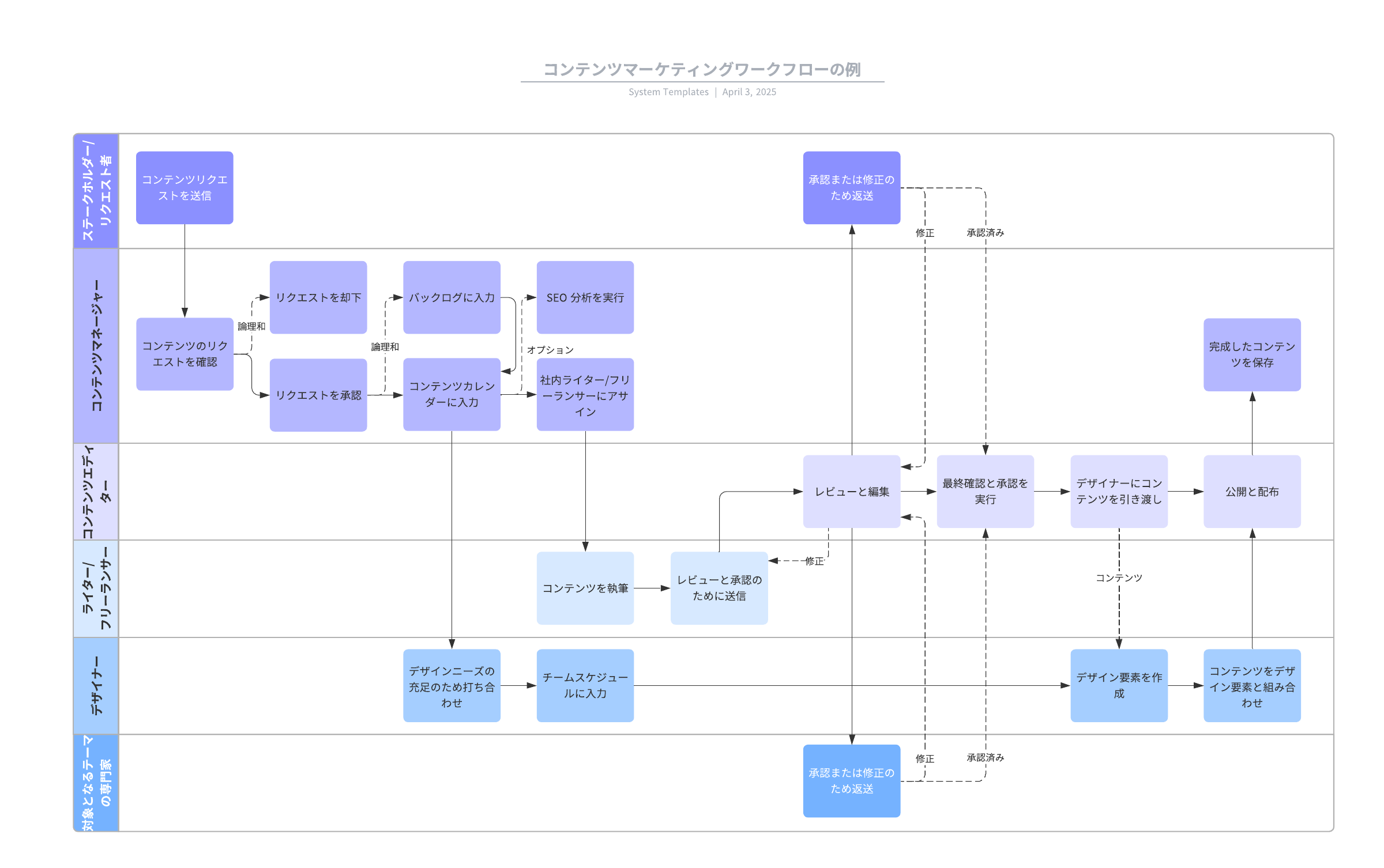 このテンプレートを開き、ユースケースに合わせてカスタマイズ可能なコンテンツマーケティングワークフロー図の例を詳しく確認してみましょう。