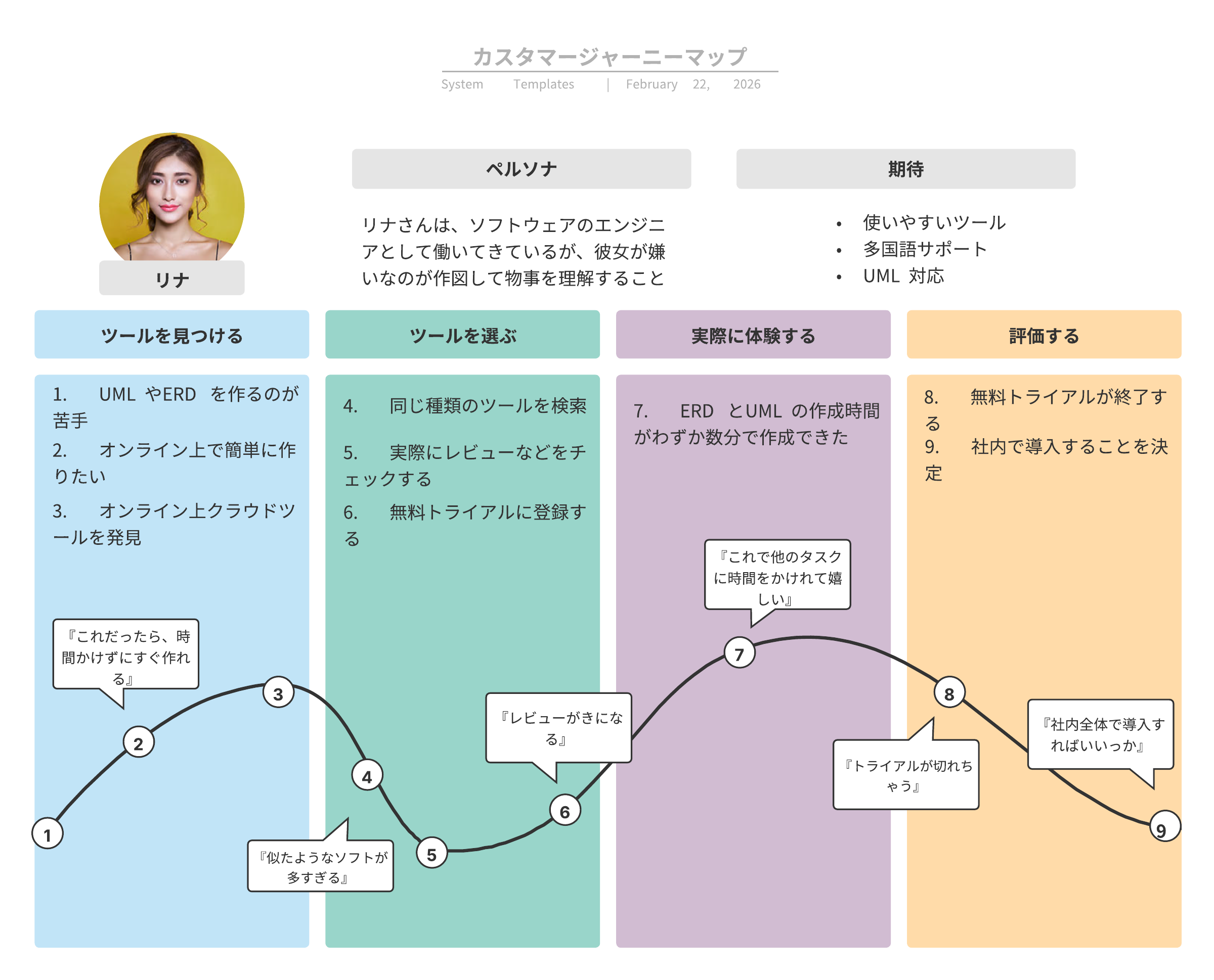 このカスタマージャーニーマップを活用して、顧客やユーザーのユーザーデータや調査をベースに、予定される行動やアクションプランを作成していきましょう。