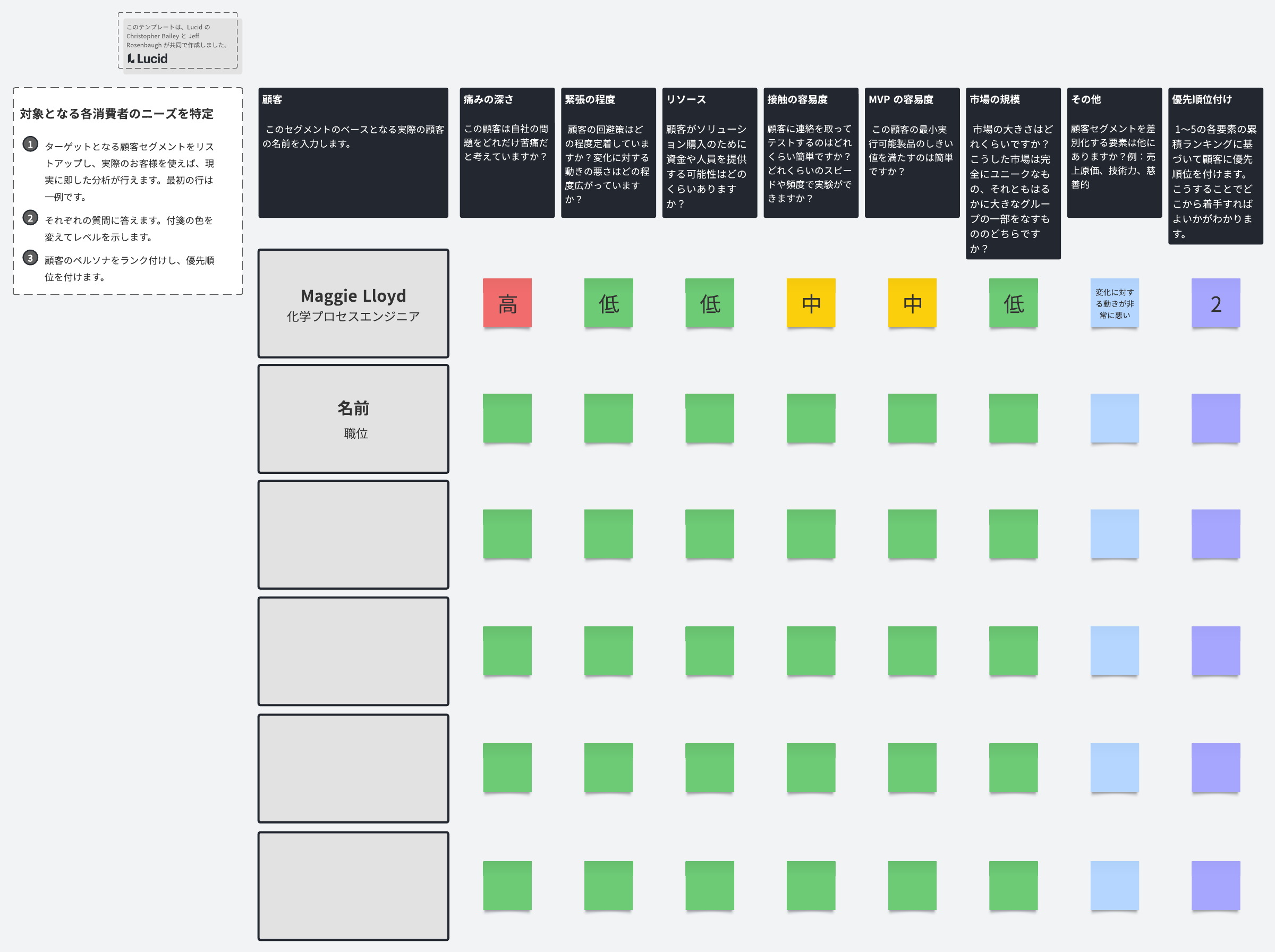このテンプレートを使用して、さまざまな顧客ペルソナを識別して優先順位を付けましょう。