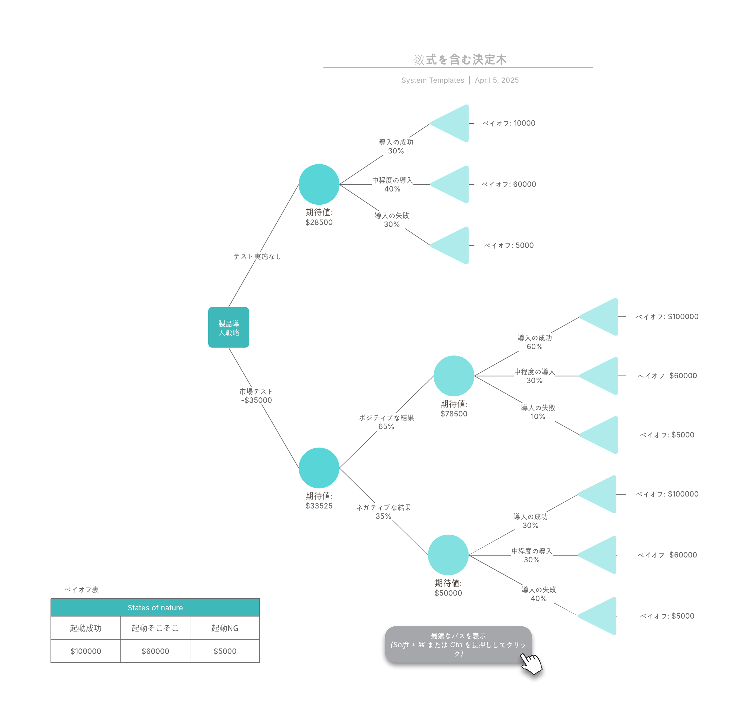 ノードはそれぞれ意思決定を表し、ノードからは、少なくとも2本の分岐が伸びています。各分岐の端の三角形は、結果を表します。このテンプレートをカスタマイズするには、まず各選択肢のペイオフをクリックします。続けて、ペイオフ値と各結果の起こる確率をカスタムデータパネルに適宜入力します。市場テストのポジティブ/ネガティブな結果となる確率、テスト実施と非実施の場合の費用をページのデータパネルに入力します。フィールドへの入力が終わったところで、最善の意思決定はどれかを判定することができます。